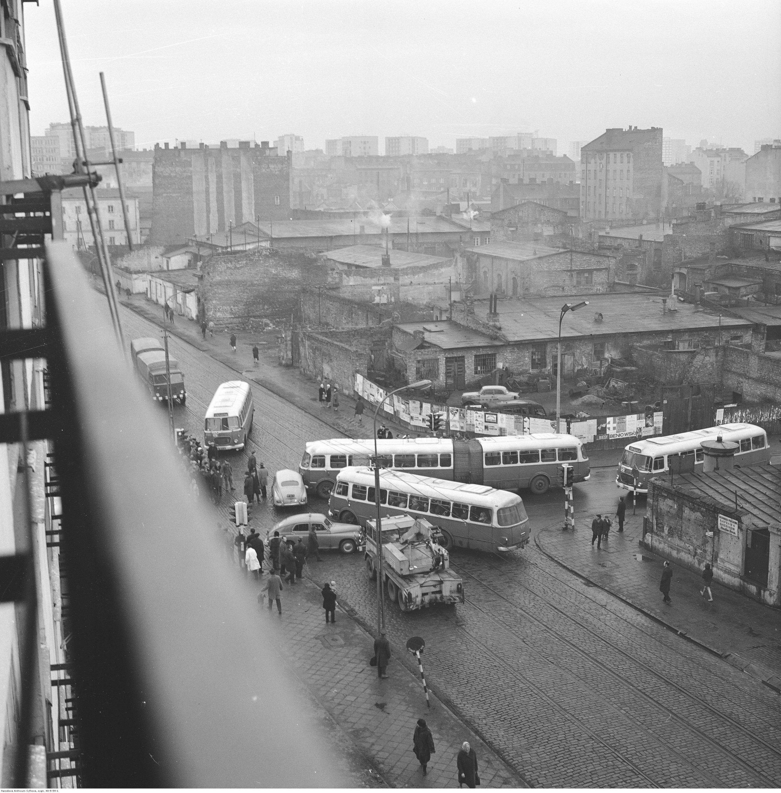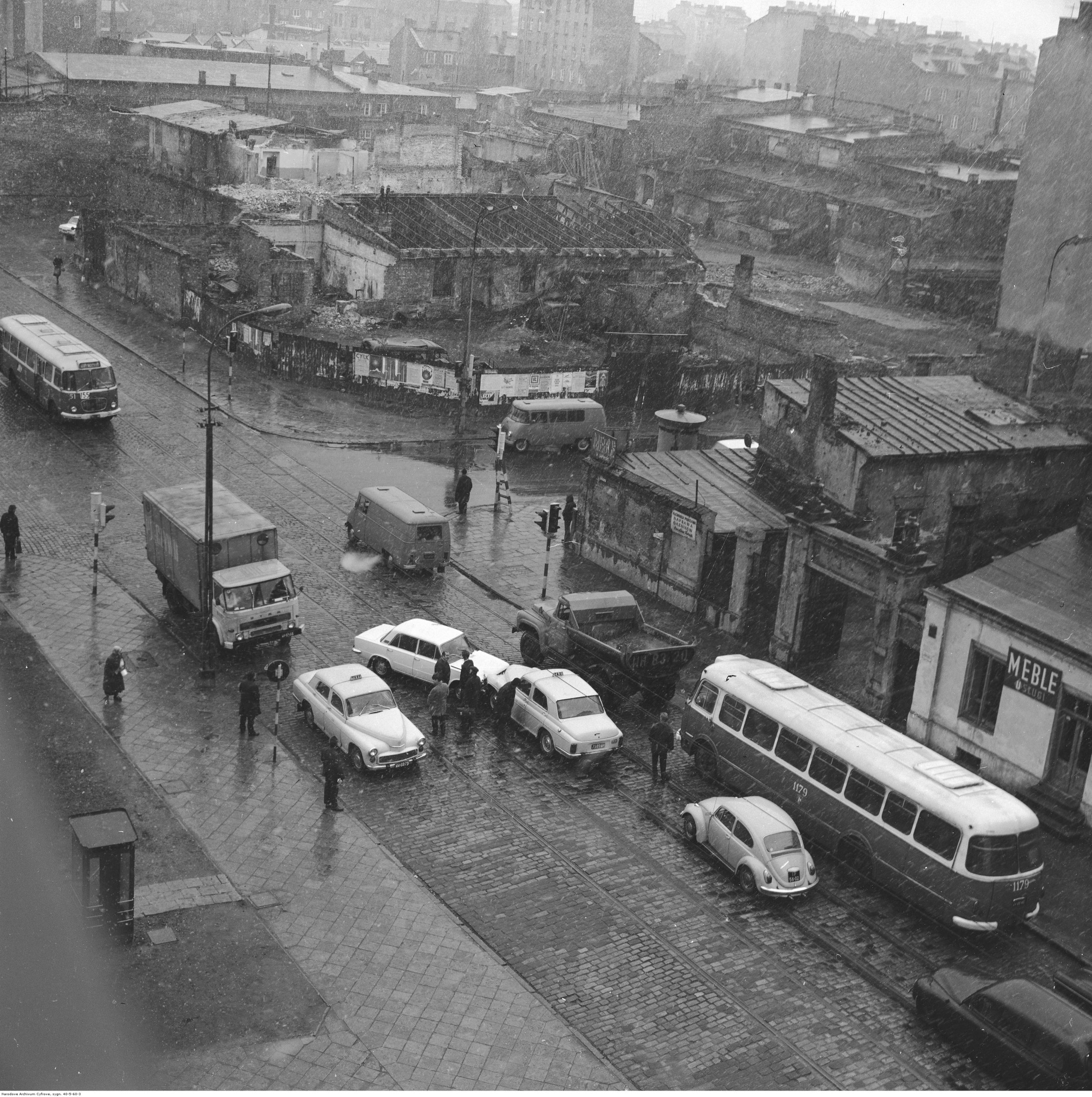Pechowe skrzyżowanie Grzybowskiej z Żelazną. Na drugim zdjęciu widzimy czołowe zderzenie dwóch polskich cudów motoryzacji, na pozostałych wymuszenie przez kierowcę Warszawy pierwszeństwa na największym ówczesnym polskim autobusie Jelczu 021. Zdjęcia powstały w odstępie kilku miesięcy – widać rozbiórkę browaru parowego widocznego za skrzyżowaniem. Za parę lat stanie tam wytwórnia Warsowin.