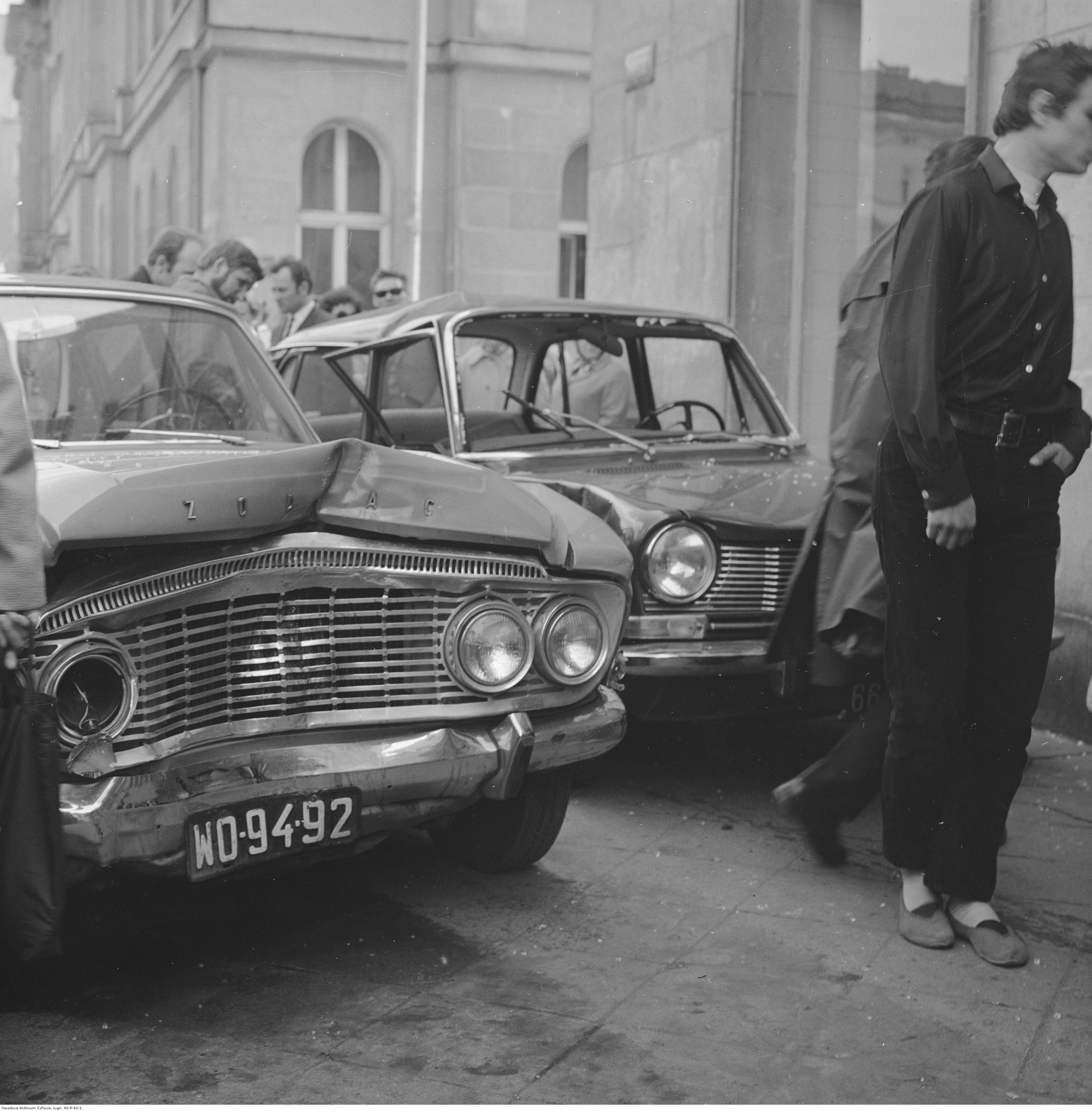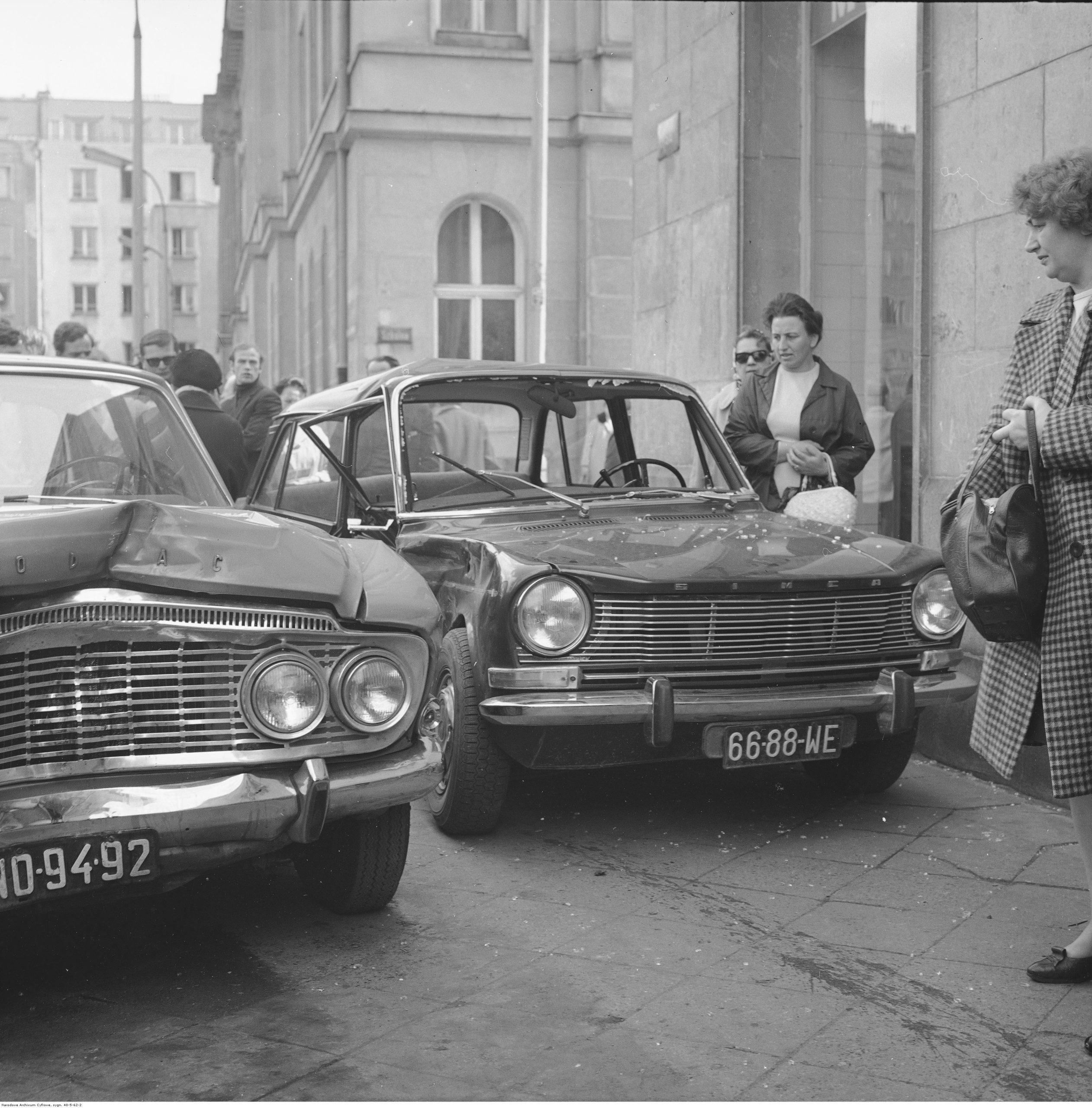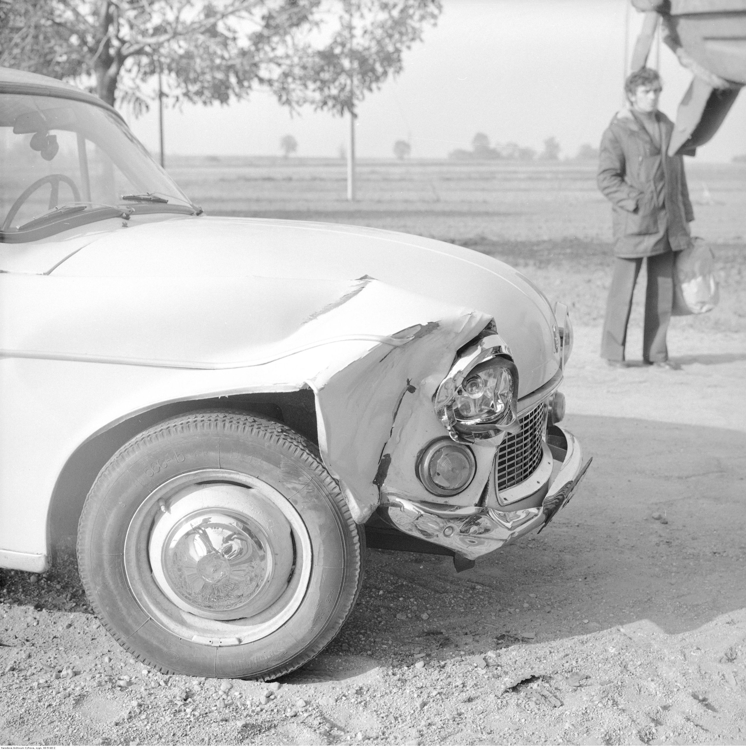 Tu też trudno osądzić co się wydarzyło. Wygląda na czołówkę, jednak niegroźną. Dlaczego? Bo autor zdjęcia prawdopodobnie prowadził Simkę. Niestety nie jest znane miejsce zdarzenia. Z ciekawostek: brunet w białej koszuli i okularach, który się kręci obok rozbitych aut to Aleksander Ścibor-Rylski, polski prozaik, scenarzysta takich filmów jak Popioły, Wilcze Echa czy Człowiek z Marmuru oraz Człowiek z Żelaza.
