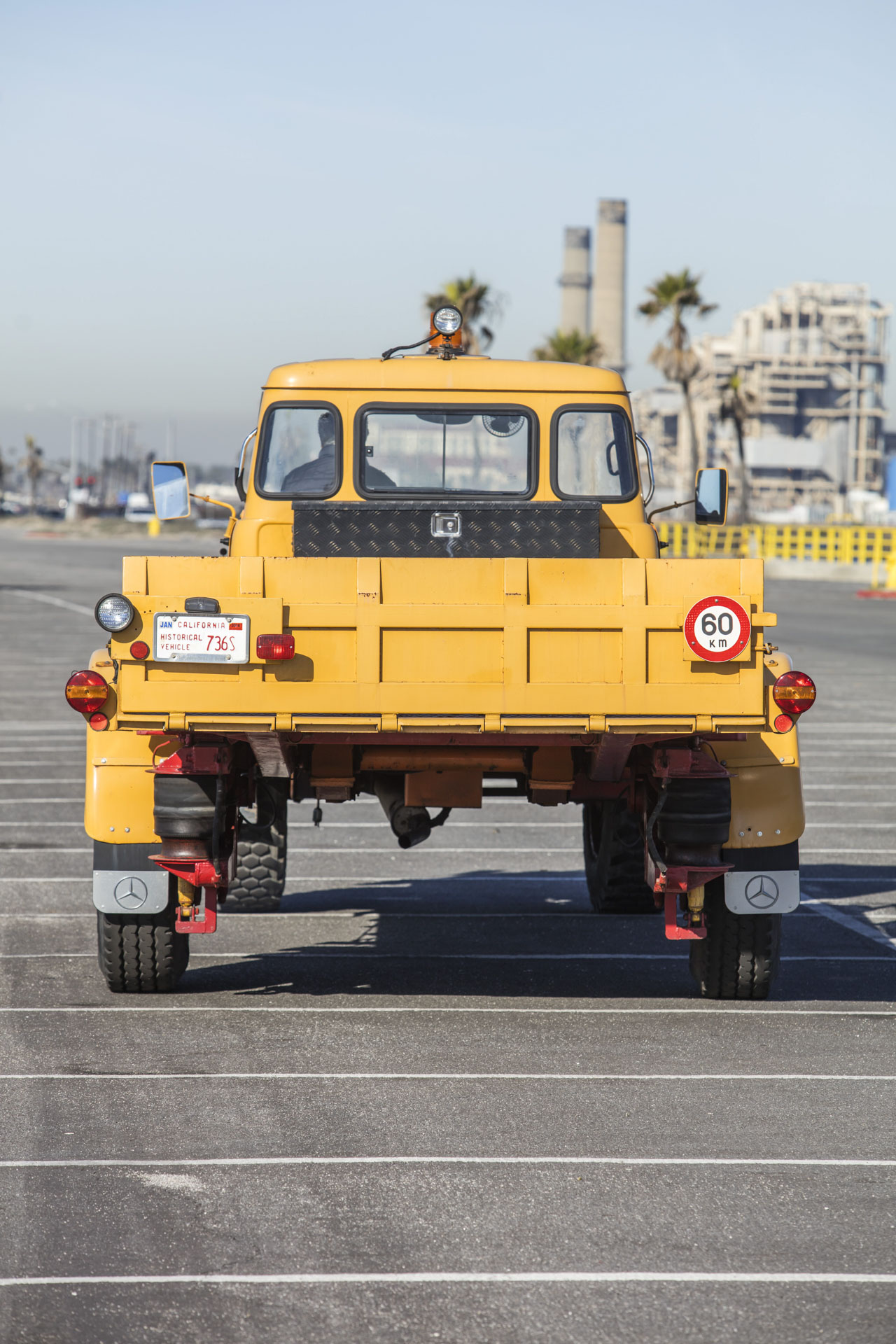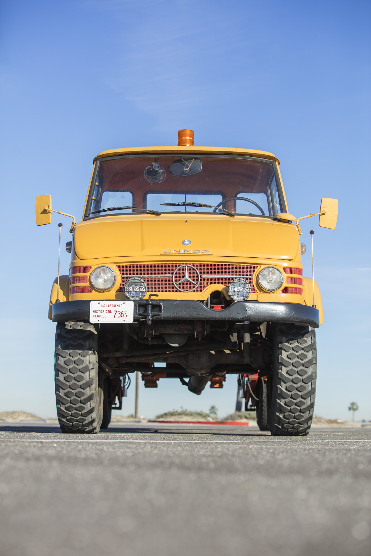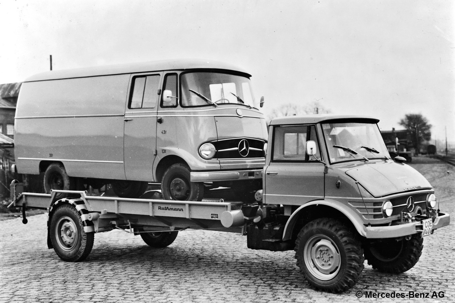 Na aukcji Bonhams w Amelia Island 5 marca 2020 roku żółta laweta Mercedes Unimog Ruthmann z 1966 roku została sprzedana za 42 560 dolarów. Po niemiecku jest pieszczotliwie nazywana Niederflurhubwagen. Firma Ruthmann wykonywała praktyczne zabudowy, dzięki którym wóz łamał się jak najęty, umożliwiając ładowanie i rozładowywanie towaru bez używania wózka widłowego lub długaśnych najazdów. Taki Ruthmann po prostu klękał na robocie i podłoga przestrzeni ładunkowej znajdowała się na poziomie ziemi. To zasługa hydrauliki, która pozwala na takie wygibasy. W tym konkretnym przypadku Unimog ma napęd na przód. Tylne koła, pozbawione komplikacji spowodowanych przeniesieniem napędu, mogą w spokoju rozjeżdżać się na boki.