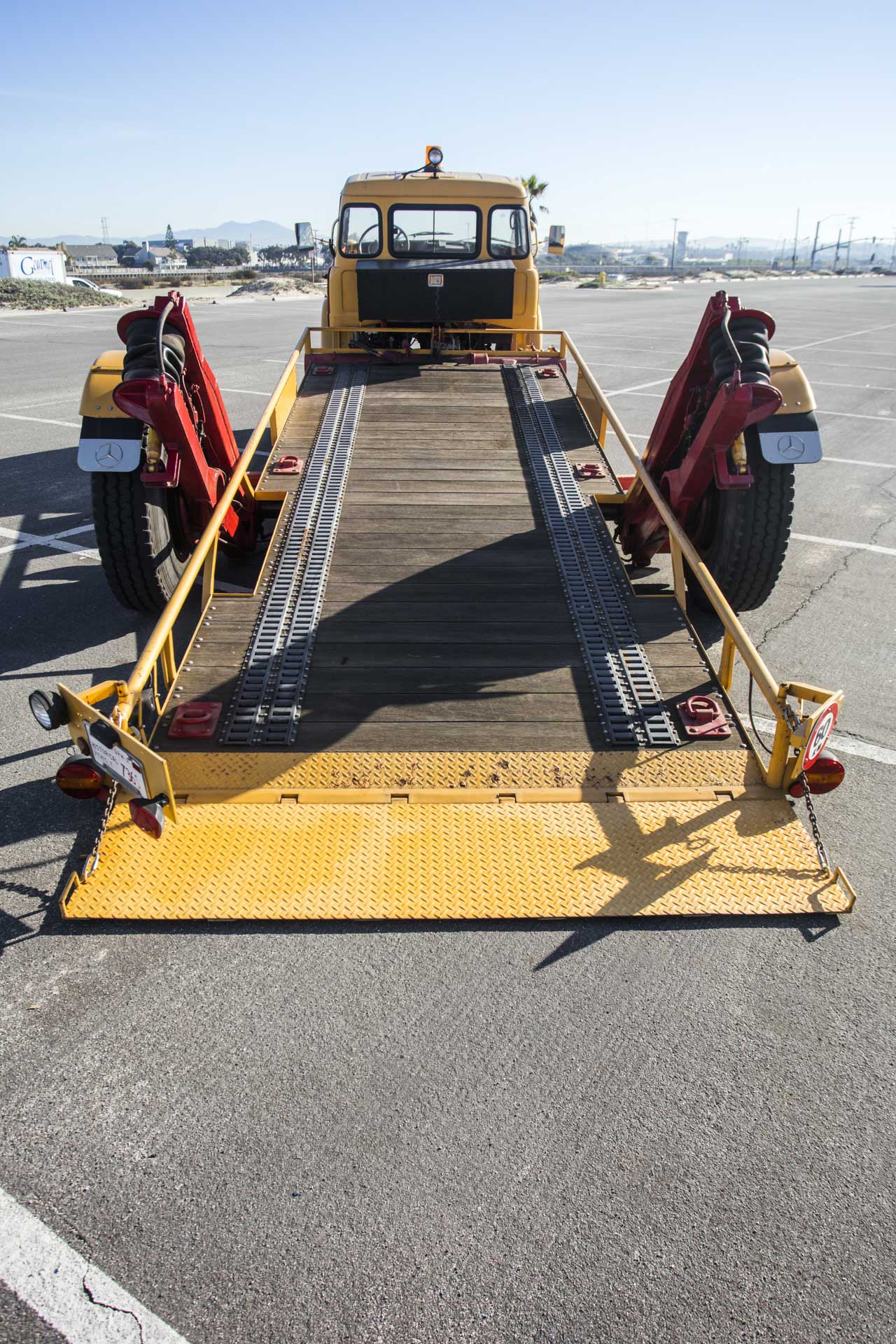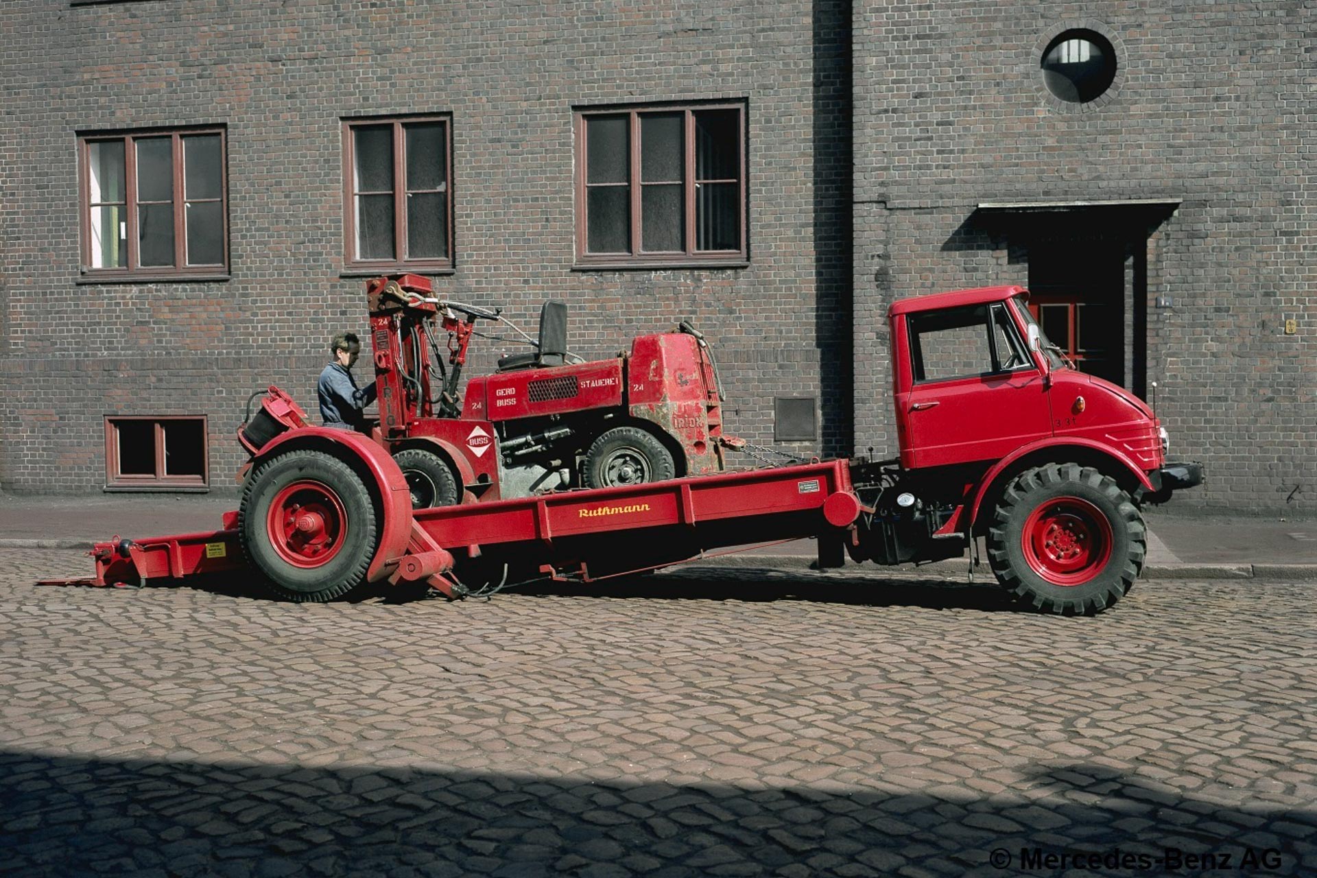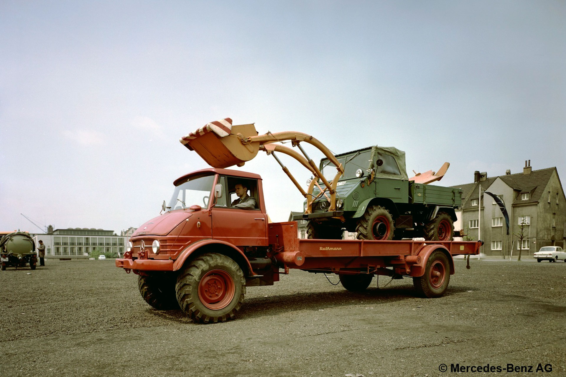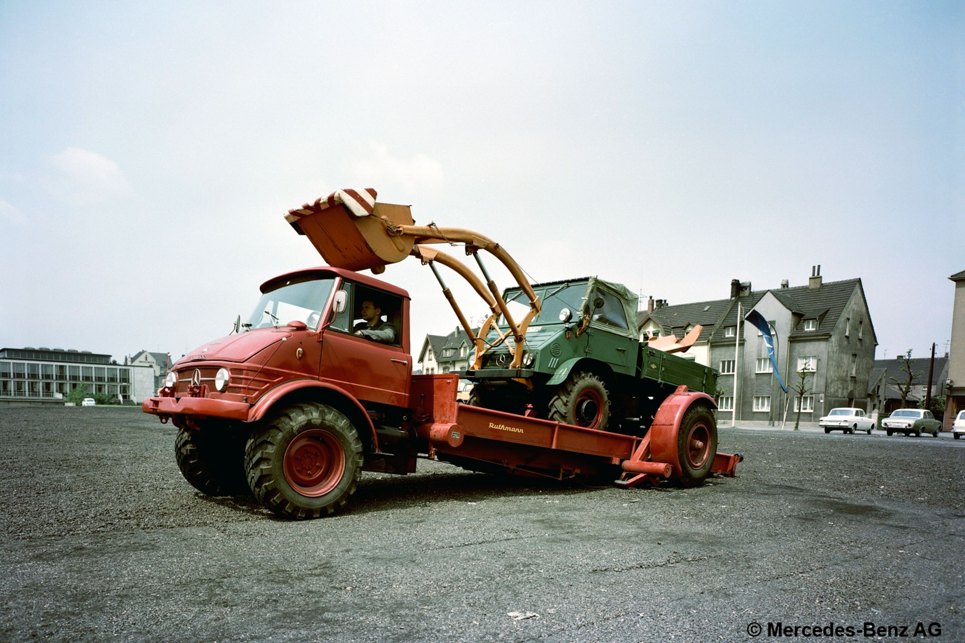Na aukcji Bonhams w Amelia Island 5 marca 2020 roku żółta laweta Mercedes Unimog Ruthmann z 1966 roku została sprzedana za 42 560 dolarów. Po niemiecku jest pieszczotliwie nazywana Niederflurhubwagen. Firma Ruthmann wykonywała praktyczne zabudowy, dzięki którym wóz łamał się jak najęty, umożliwiając ładowanie i rozładowywanie towaru bez używania wózka widłowego lub długaśnych najazdów. Taki Ruthmann po prostu klękał na robocie i podłoga przestrzeni ładunkowej znajdowała się na poziomie ziemi. To zasługa hydrauliki, która pozwala na takie wygibasy. W tym konkretnym przypadku Unimog ma napęd na przód. Tylne koła, pozbawione komplikacji spowodowanych przeniesieniem napędu, mogą w spokoju rozjeżdżać się na boki.