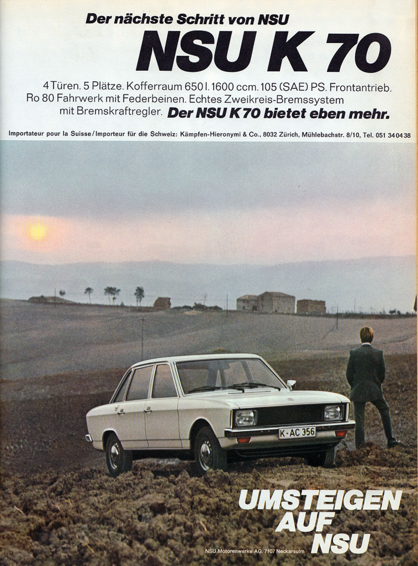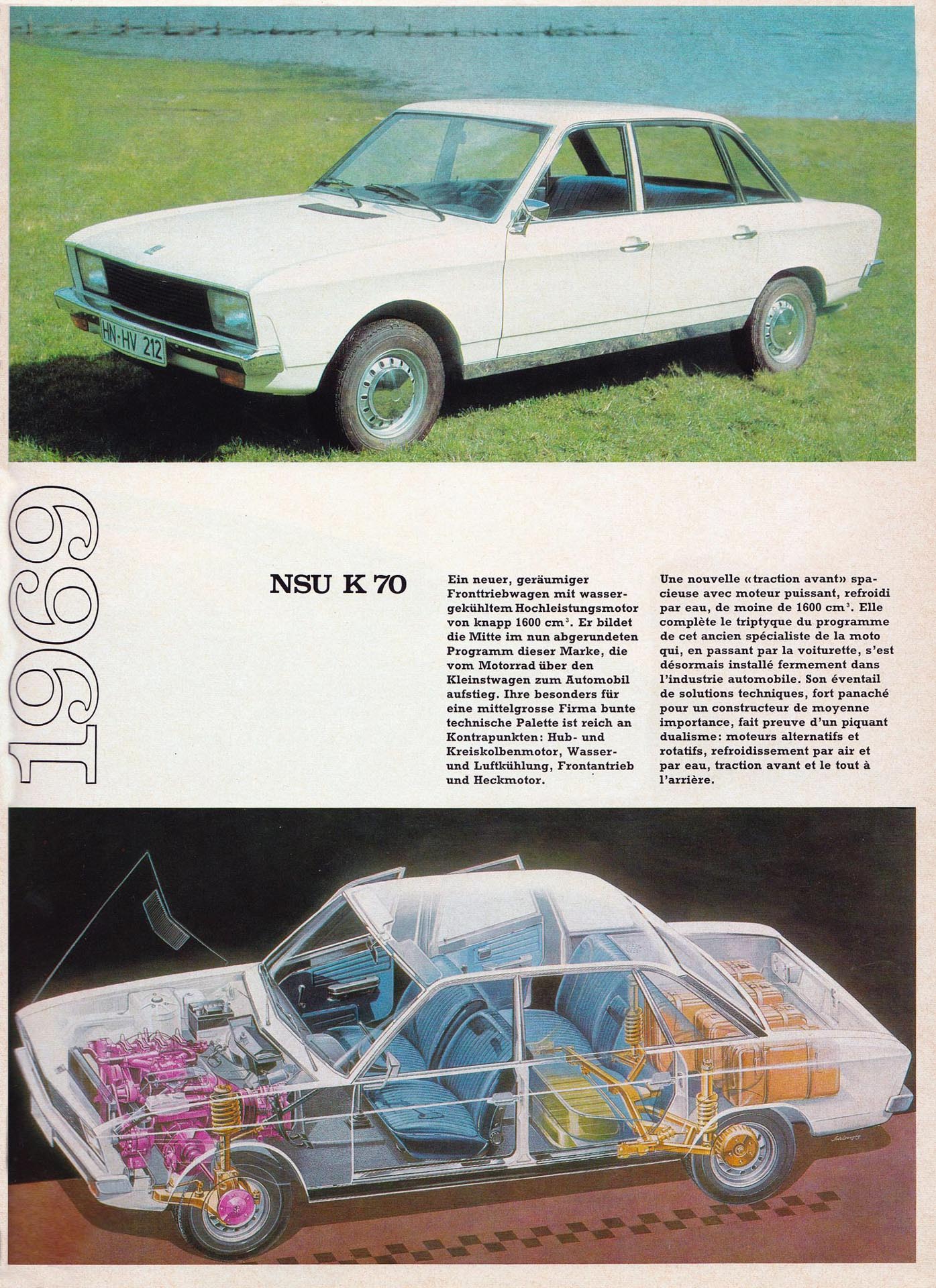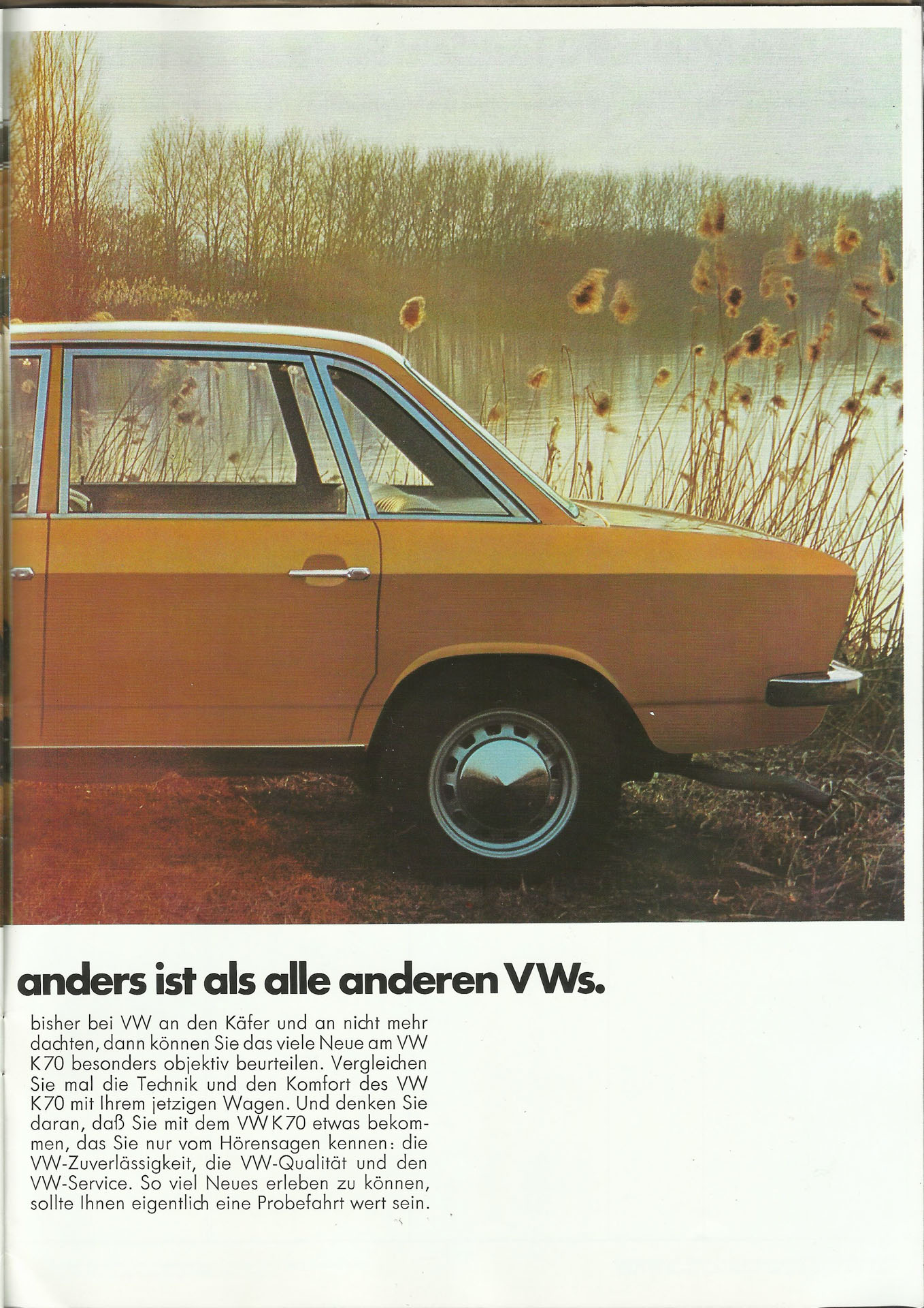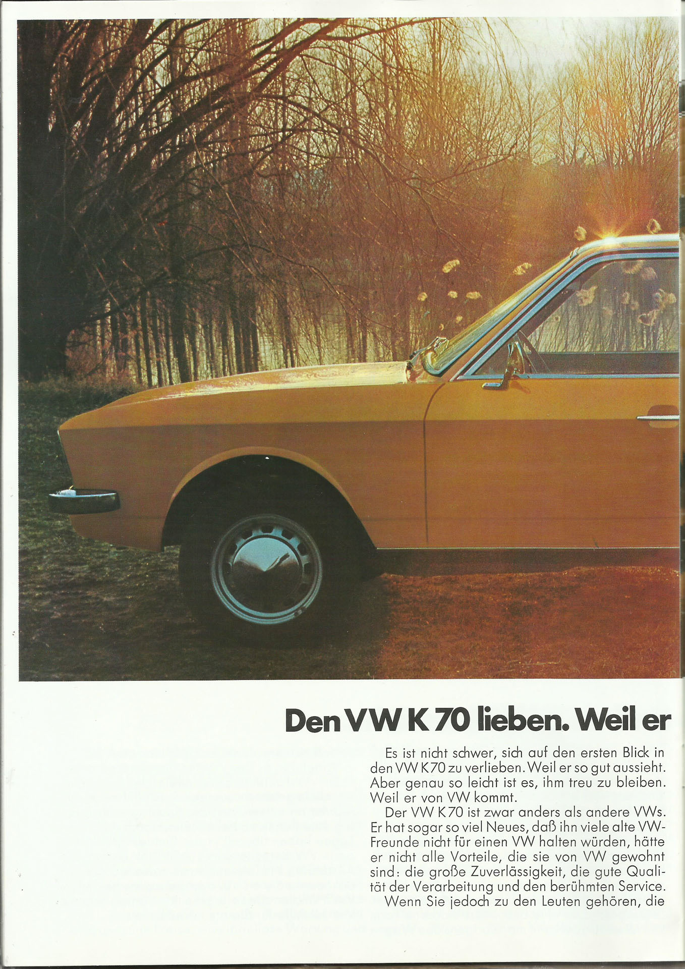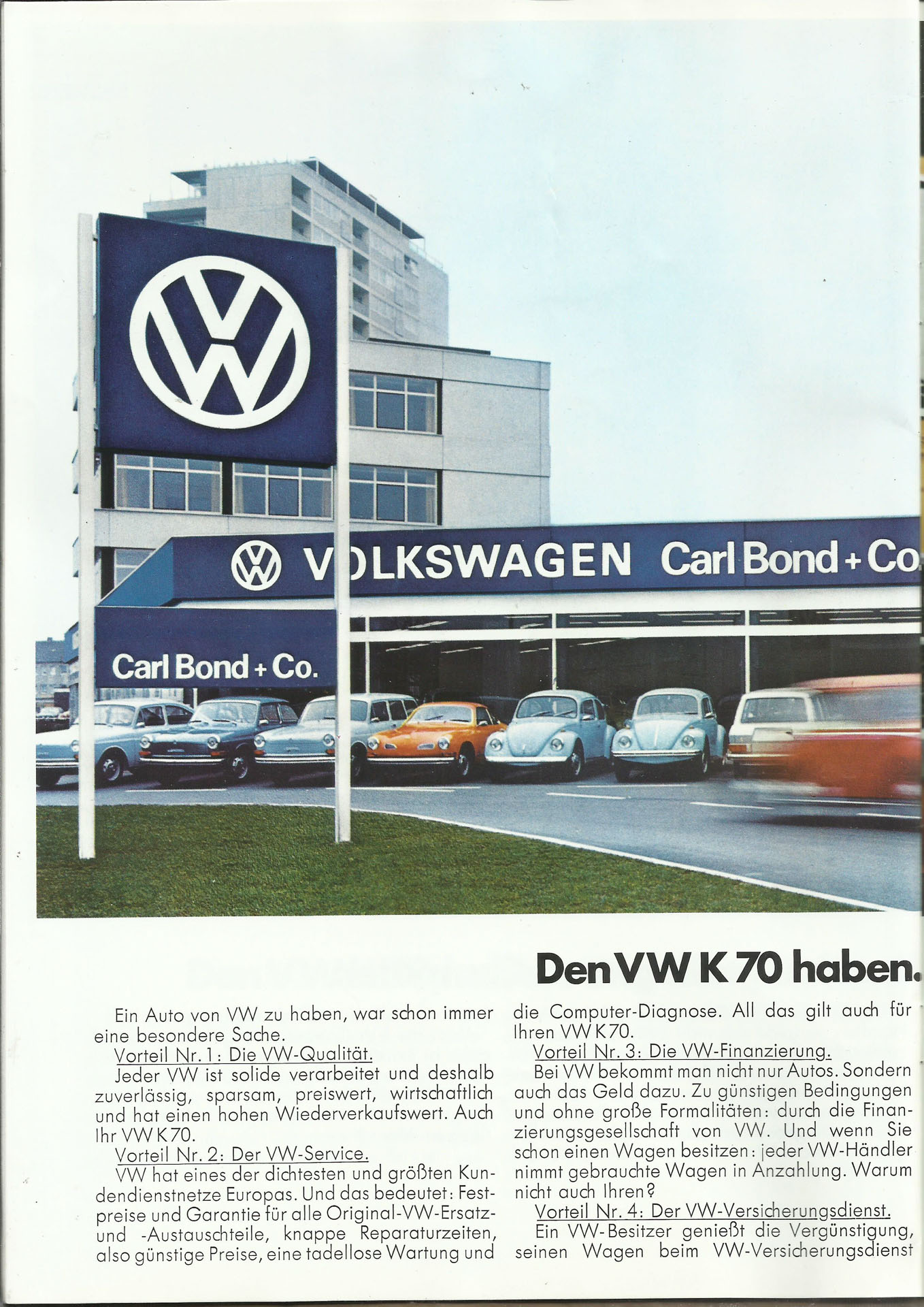 Wszystko wydarzyło się za sprawą wykupienia w 1969 roku zakładów NSU. Firma z Neckarsulm czekała wówczas w blokach startowych by wprowadzić nową maszynę na rynek. Nawet zaplanowano premierę K70 w Genewie, wydrukowano katalogi i wysłano press-pack’i do dziennikarzy. Nowy właściciel, czyli koncern Volkswagena, zabronił jednak jego prezentacji. W Wolfsburgu była obawa, że samochód będzie wewnętrzną konkurencją dla debiutującego w tym samym okresie Audi 100.