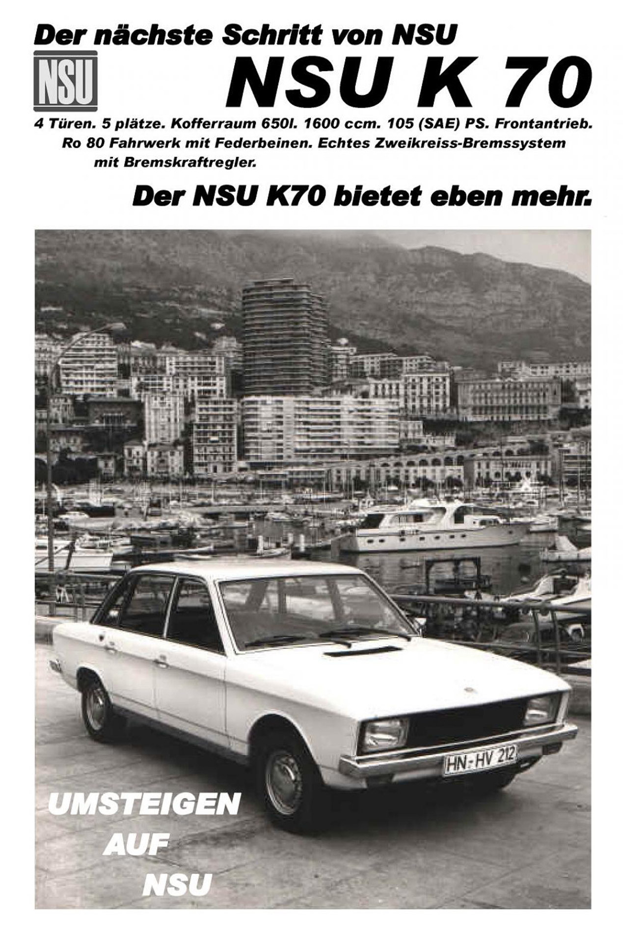 NSU weszło do jednej spółki z Auto Union tworząc koncern Audi NSU Auto Union AG. Głupio byłoby wypuszczać konkurencyjny wóz w tej samej firmie. Obie maszyny wyposażono w przedni napęd i modne, zgrabne nadwozia typu sedan. Pieniądze na rozwój samochodu zostały jednak wydane, a także powstało już 23 sztuki K70 ze znaczkiem NSU. Pragmatyczni Niemcy nie mogli tego wyrzucić do kosza. Tym bardziej, że stworzony przez Ewalda Praxla samochód zapowiadał się naprawdę znakomicie. Przedni napęd, nowy silnik o pojemności skokowej 1,6-litra, będący rozwinięciem motoru 1.2 stosowanego w NSU typ 110 (później 1200), nowoczesne zawieszenie na kolumnach McPhersona z przodu, wentylowane tarcze hamulcowe montowane przy zespole napędowym. No i na deser projekt nadwozia Clausa Luthe. Twórcy wcześniejszego NSU Ro80, późniejszych Audi 50, BMW E30 oraz ulubieńca polskiej publiczności – BMW E36.