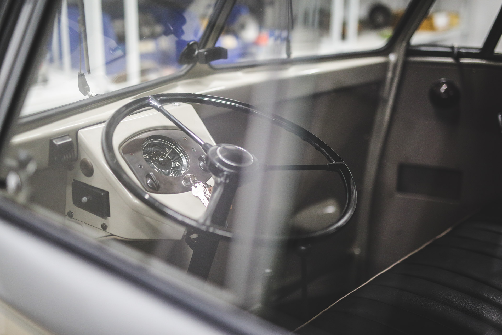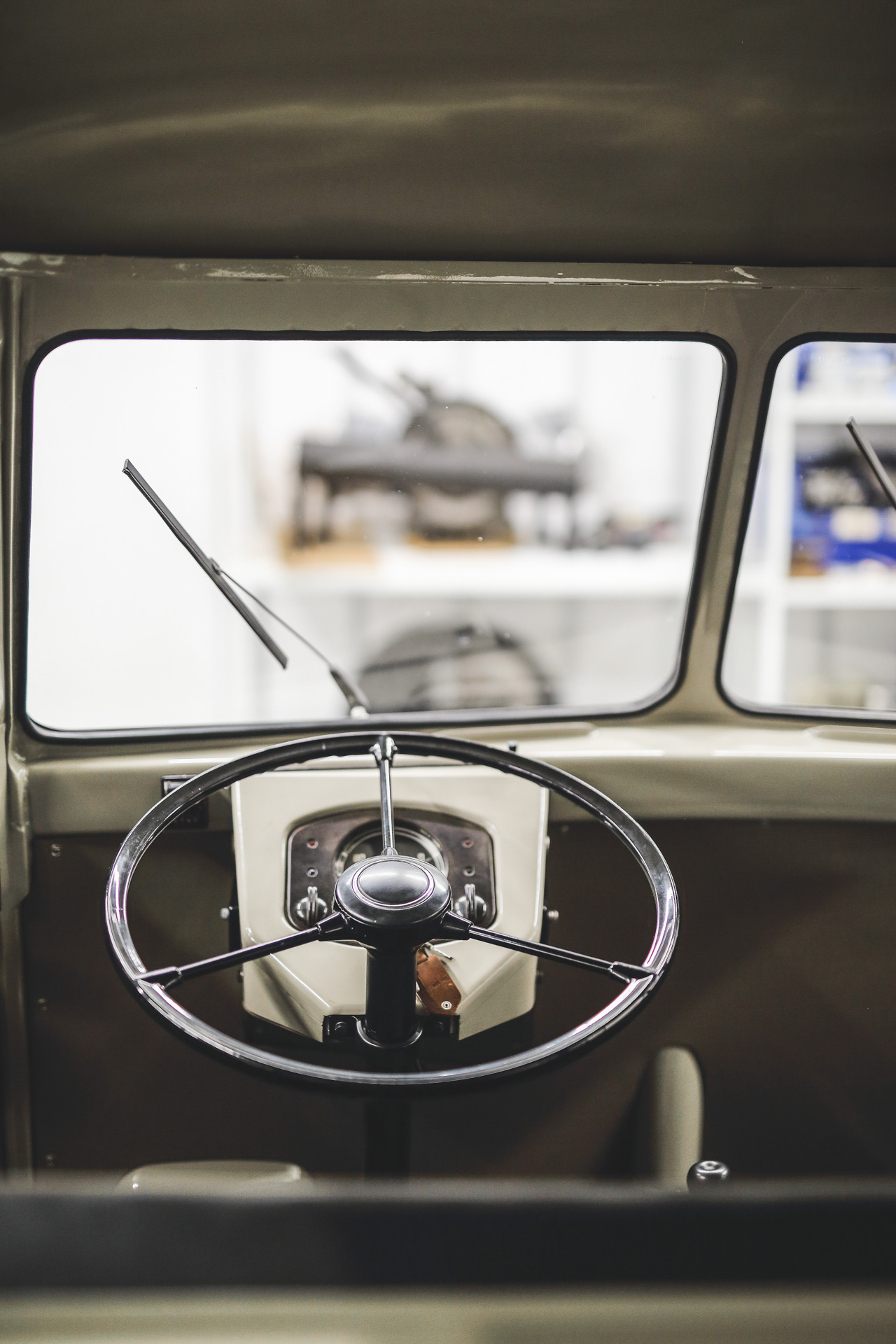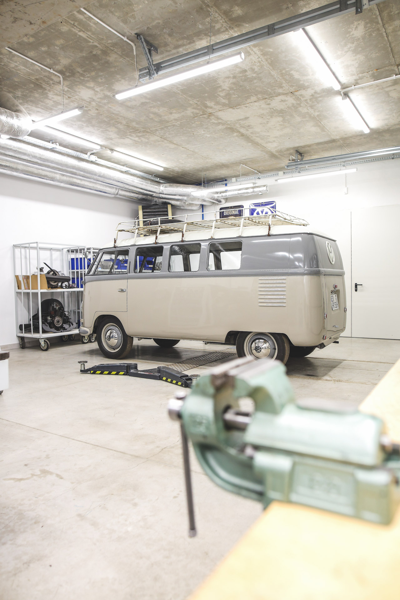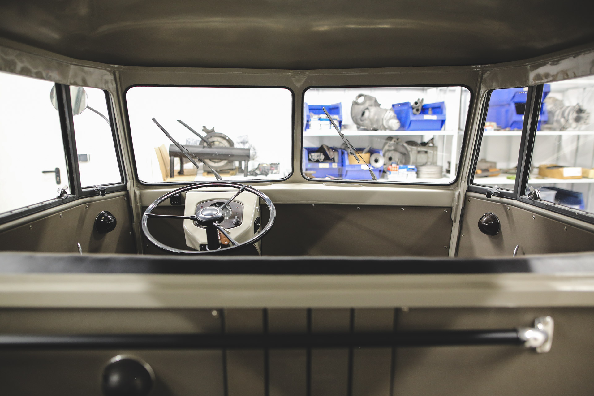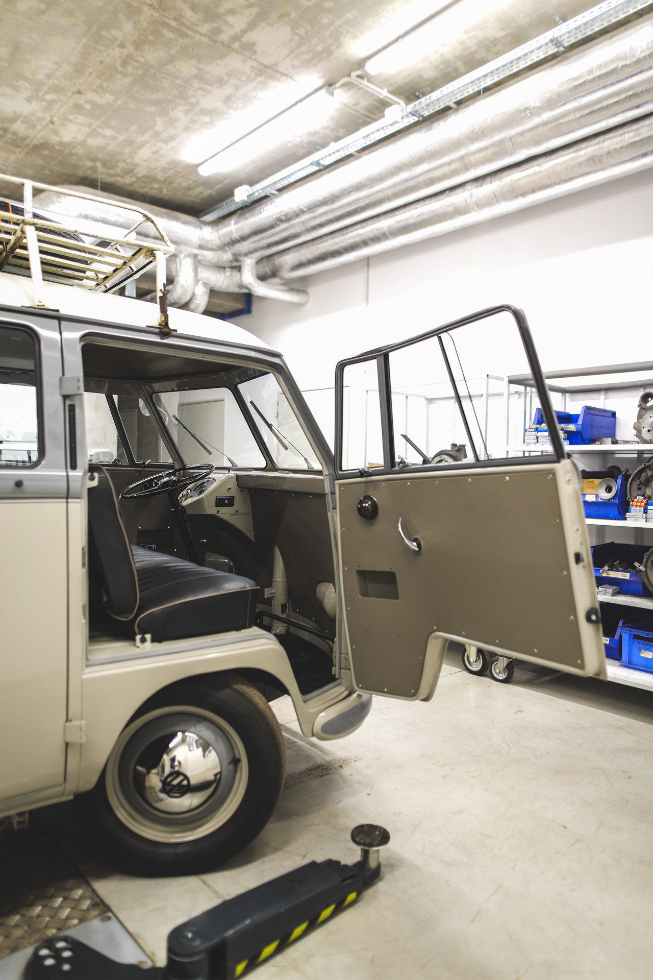 Volkswagen Transporter trafił do warsztatu Marka Spicera, któremu udało się odzyskać wewnętrzne panele z zachowaniem oryginalnego materiału. Wymagało to nie lada umiejętności i precyzji, bo były pokryte kilkoma warstwami farby i pogniłe tu i ówdzie. Teraz oczy cieszy perfekcyjnie odrestaurowany wóz. Niezwykłe jest to co zachwyca w tym T1 – asceza. Charakterystyczne dla wczesnych Transporterów olbrzymie logo VW z tyłu i brak przeszklenia tylnej części. Auto wygląda trochę jak z komiksu, a raczej ze snów Ferdynanda Porsche i Hansa Ledwinki o dostawczaku przyszłości.
