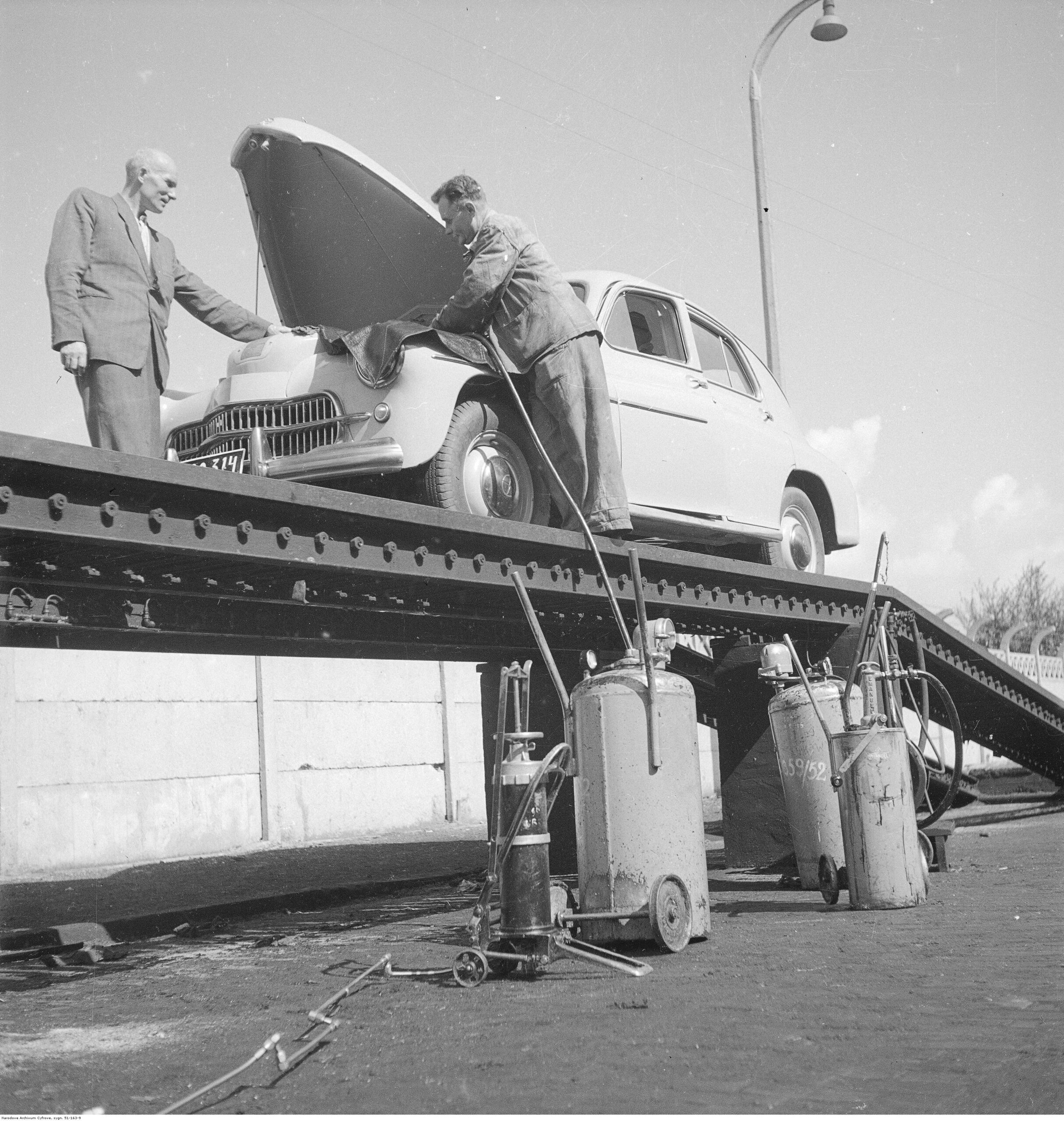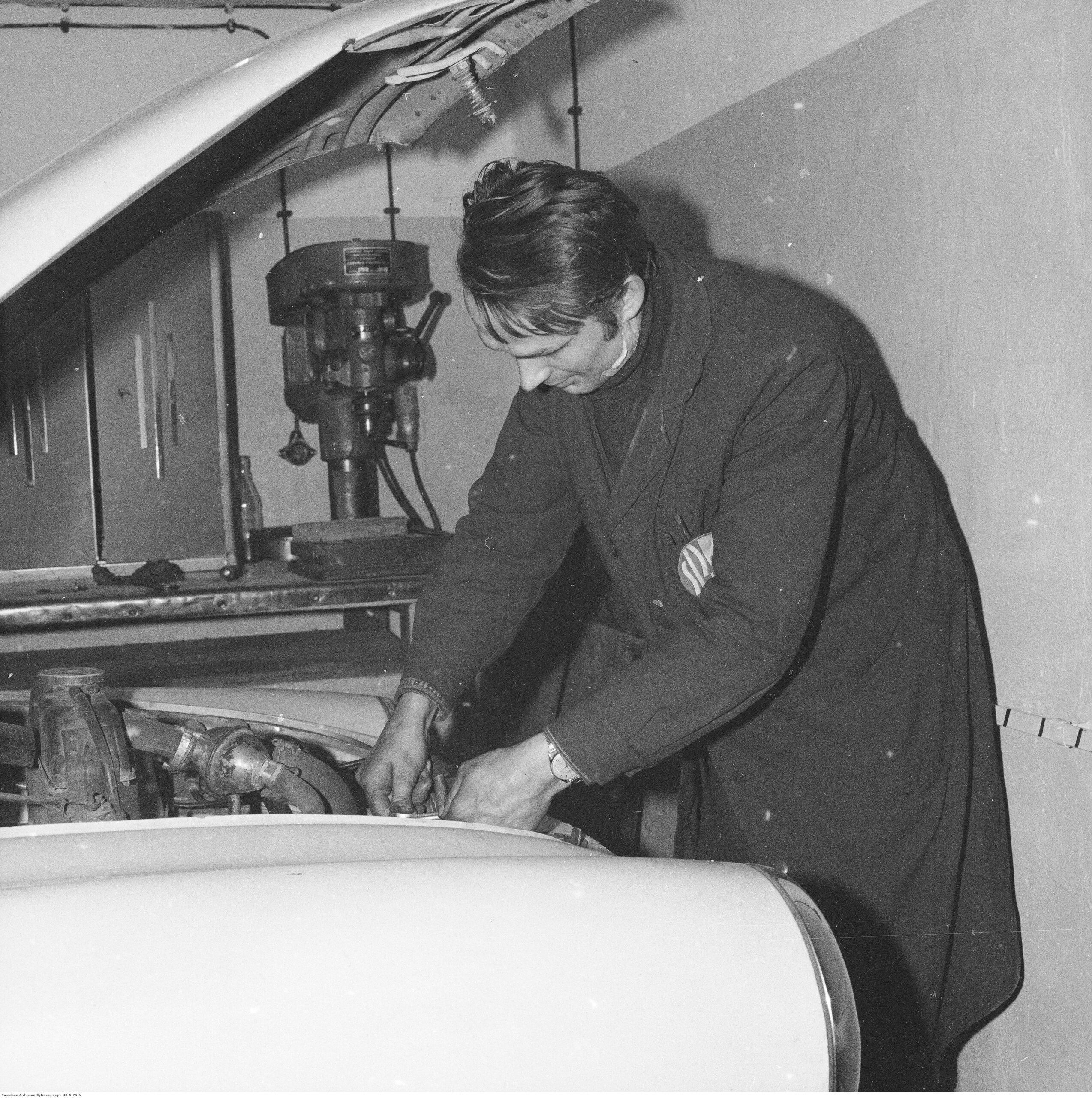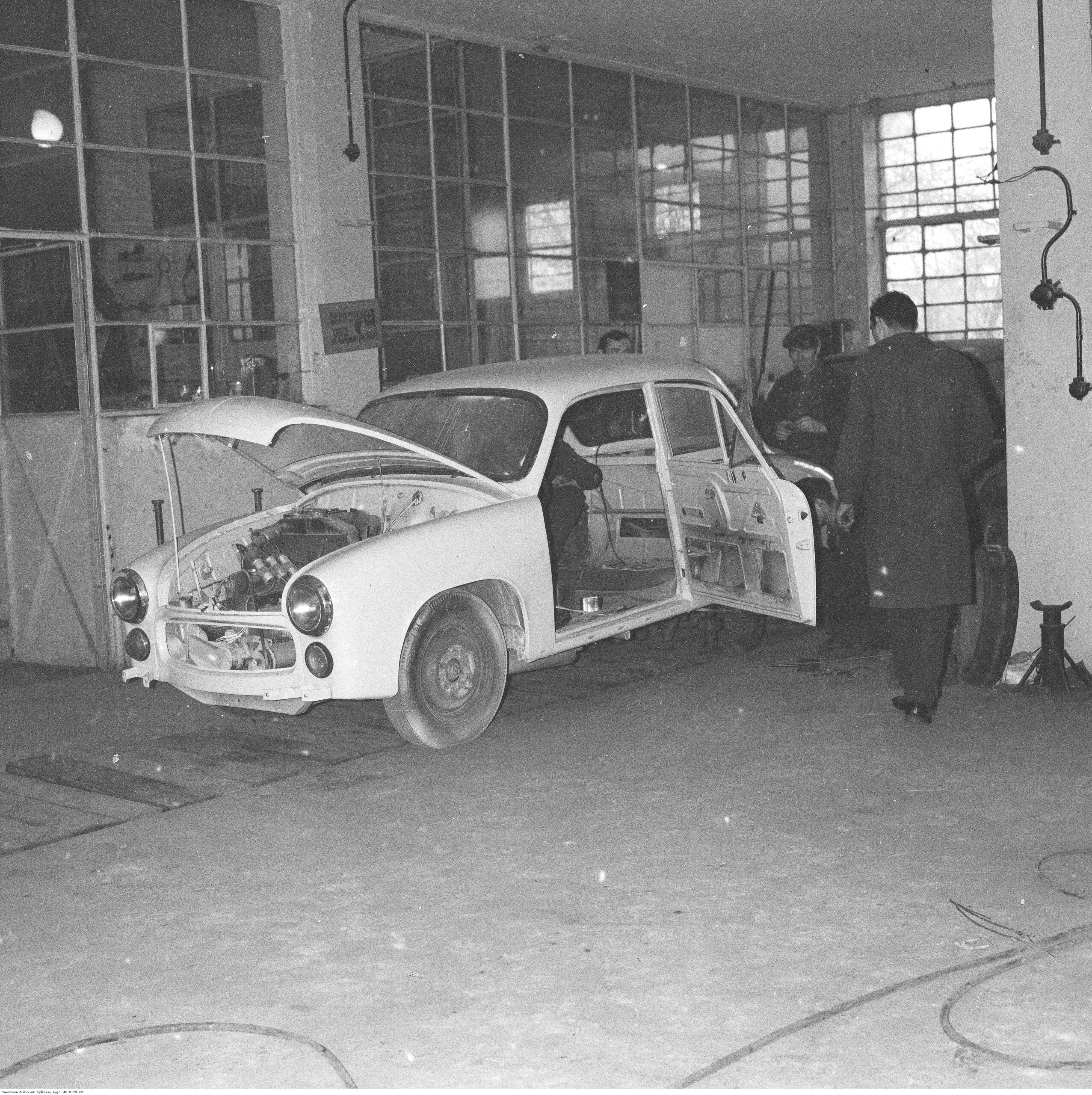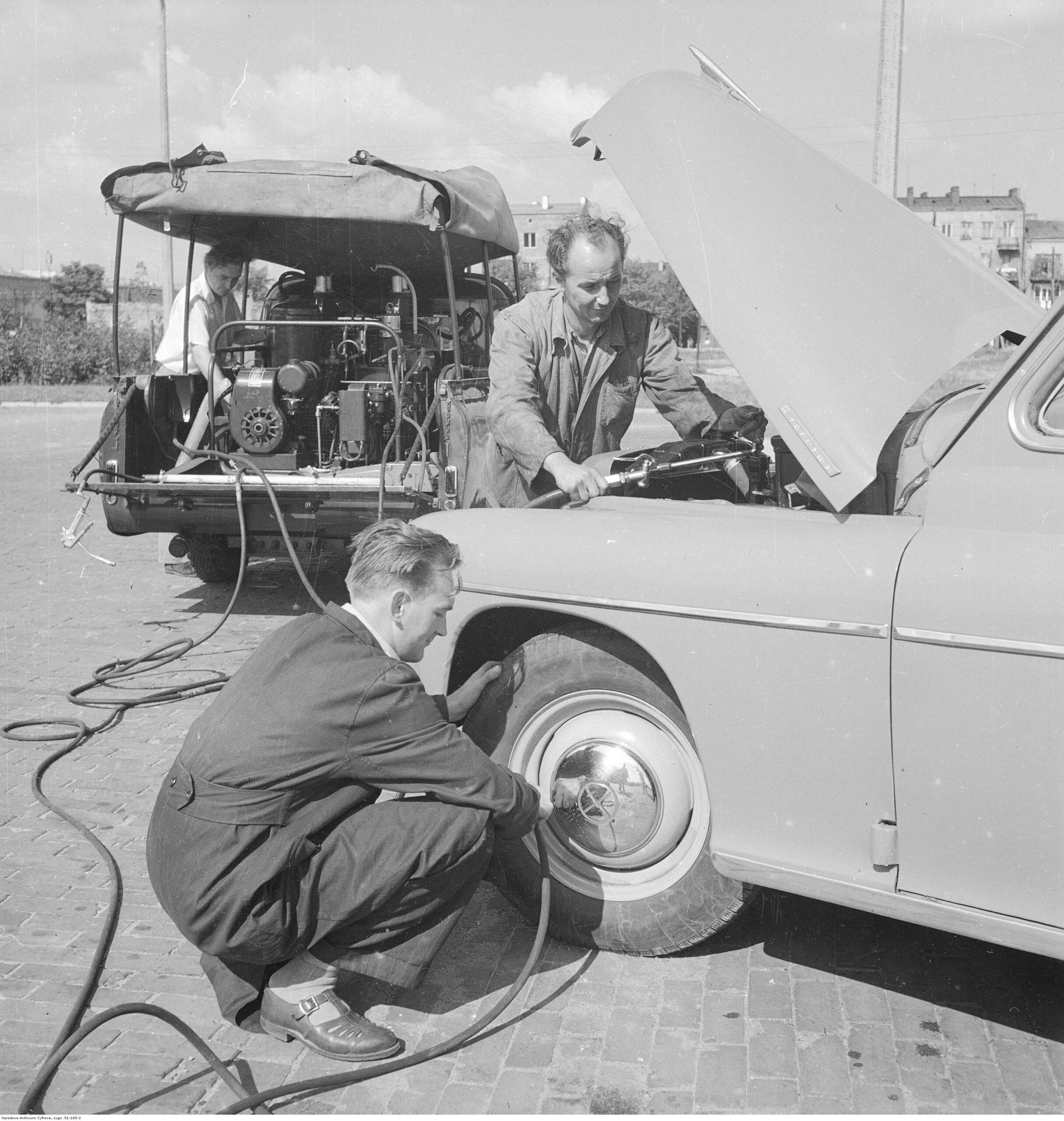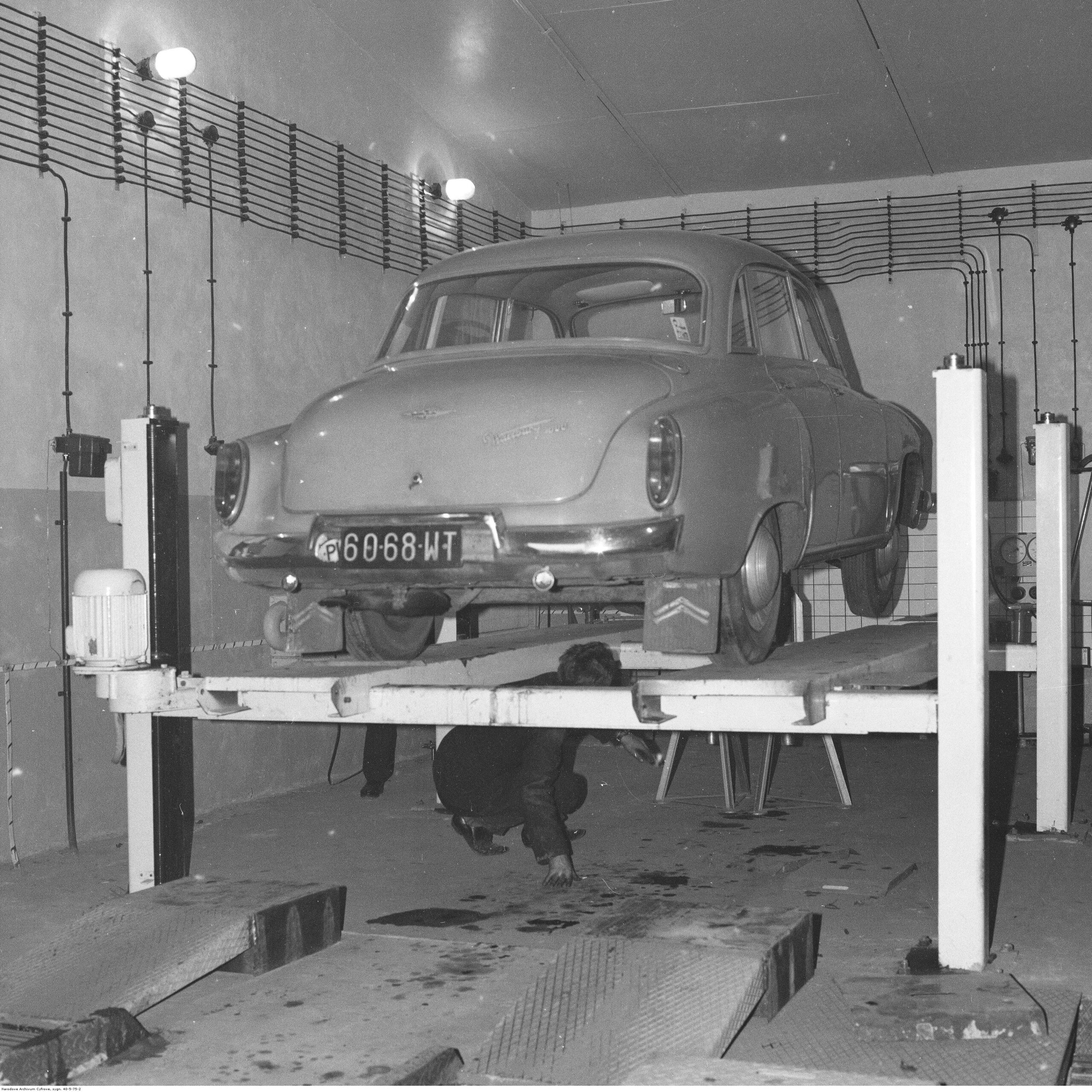 Na zdjęciach, które dla Was znaleźliśmy w Narodowym Archiwum Cyfrowym choć trochę można zobaczyć jak wyglądała praca mechanika w latach 60 i 70. Jedna z galerii ukazuje Stację TOS w Warszawie przy ulicy Omulewskiej 27. Warsztaty powstały w 1955 roku i początkowo nie cieszyły się zbyt dobrą opinią. W 1962 roku tygodnik Motor opisywał niebywałą przemianę jaka nastąpiła na Omulewskiej. Redaktor zalecał rozglądanie się za wycieraczkami aby oczyścić buty przed wejściem na sterylną halę napraw. Z ciekawostek – na jednym ze zdjęć widać rozbitą Simkę Aronde. To wóz Zbyszka Siemaszki, opisywany przez nas już dwukrotnie przy okazji cyklu Karambolage oraz naszej wyprawy „Śladami Siemaszki”. Budynki na Omulewskiej stoją nadal i nadal spełniają swoją rolę. Obecnie znajduje się w nich serwis samochodów oraz warszawskie biuro przedsiębiorstwa Sobiesława Zasady.