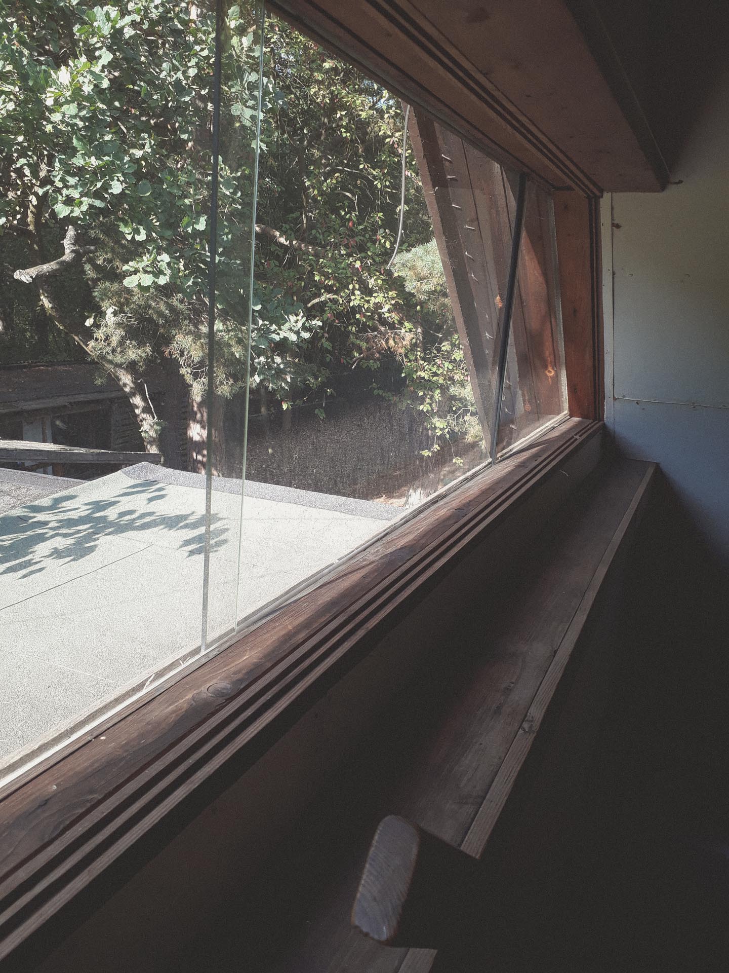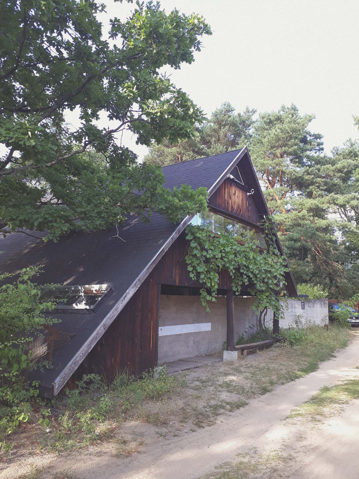 Jednak zanim tam dojedziemy, mijamy drewniany dom w kształcie trójkąta. Osoby, dla których nie ma różnicy między modernizmem, a postmodernizmem, trójkątny budynek nic powie. Ot, zwykły domek letniskowy z kawałkiem betonu na dole. Dla innych będzie ciekawy, inny, dziwny. Uwagę zwracają pasy okien na górze, a pod drewnianą elewacją skrywa się wspomniany betonowy płot, który w naturalny sposób przechodzi w ścianę oddzielającą wnętrze domu od ulicy. Jeśli stojąc przy ścianie podskoczymy, to zobaczymy domowników jedzących poranną jajecznicę. Ów budynek to cel naszej wycieczki – letni Dom Oskara i Zofii Hansenów.