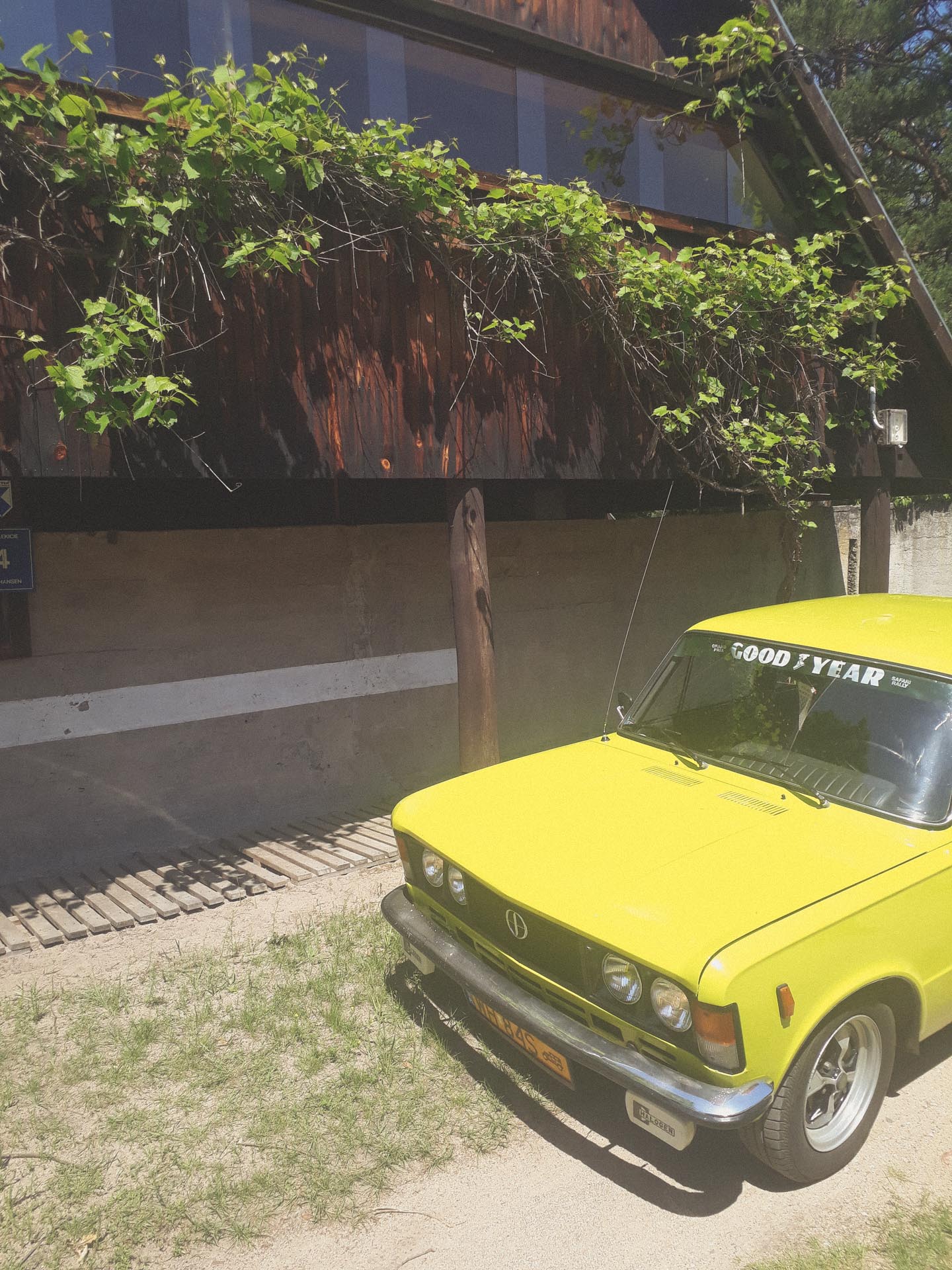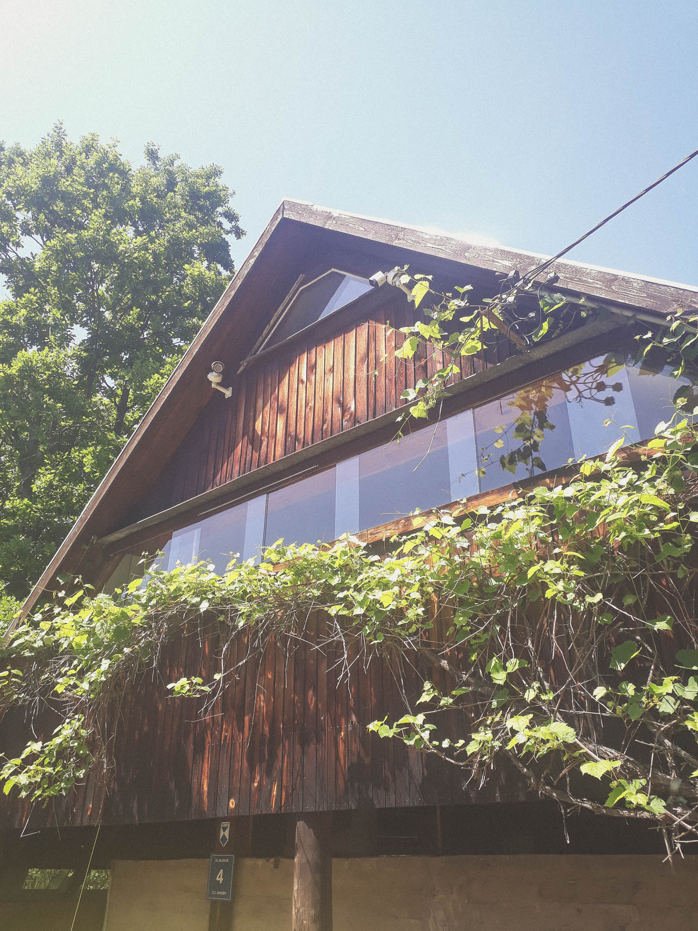 Sam budynek nie jest specjalnie ładny, lecz nie chodzi tu o kanony potocznie rozumianego piękna. Oczywiście od frontu sprawia lepsze wrażenie od innych obiektów tego typu. Bluszcz pnący się po fasadzie, pasmowe okna w stylu Le Corbusiera i betonowa ściana na dole robią swoje. Na pewno cieszą oko turysty idącego na spacer nad rzekę. Ale w środku, za płotem i od strony podwórka nie starano się upiększyć elewacji na siłę. Od tyłu domek to właściwie sam dach schodzący do ziemi z dziurą na taras. Obok wybudowano mały budynek gospodarczy, równie zachwycający co główny dom.