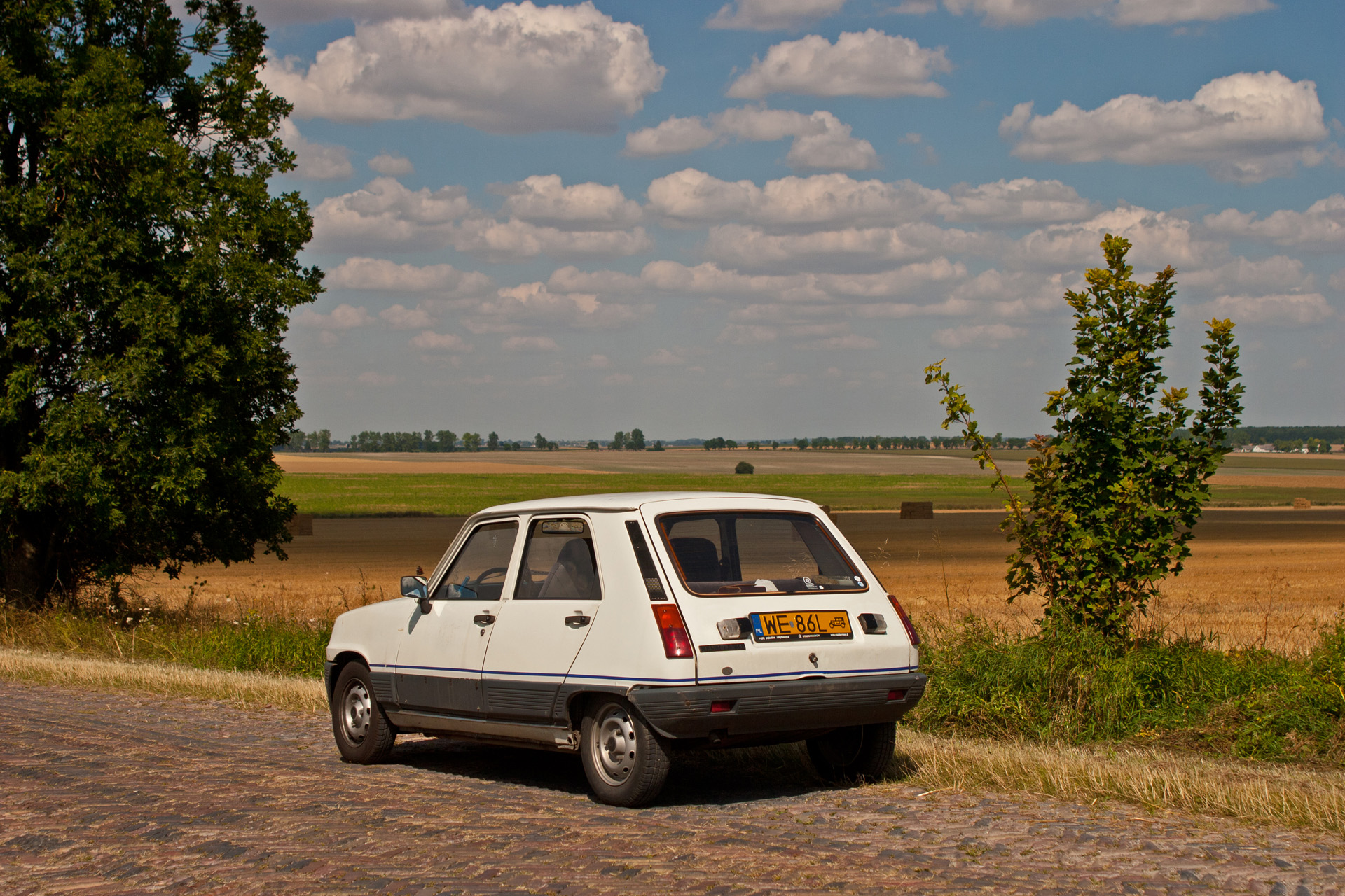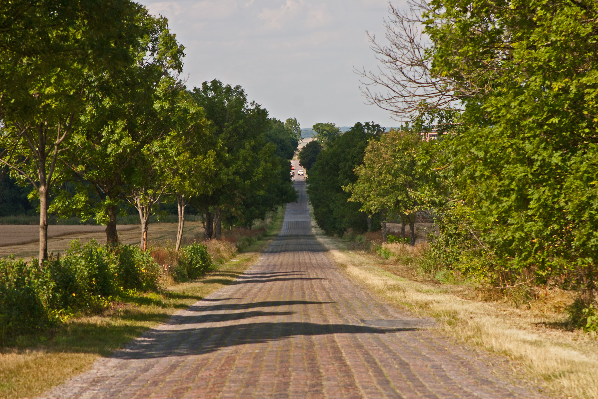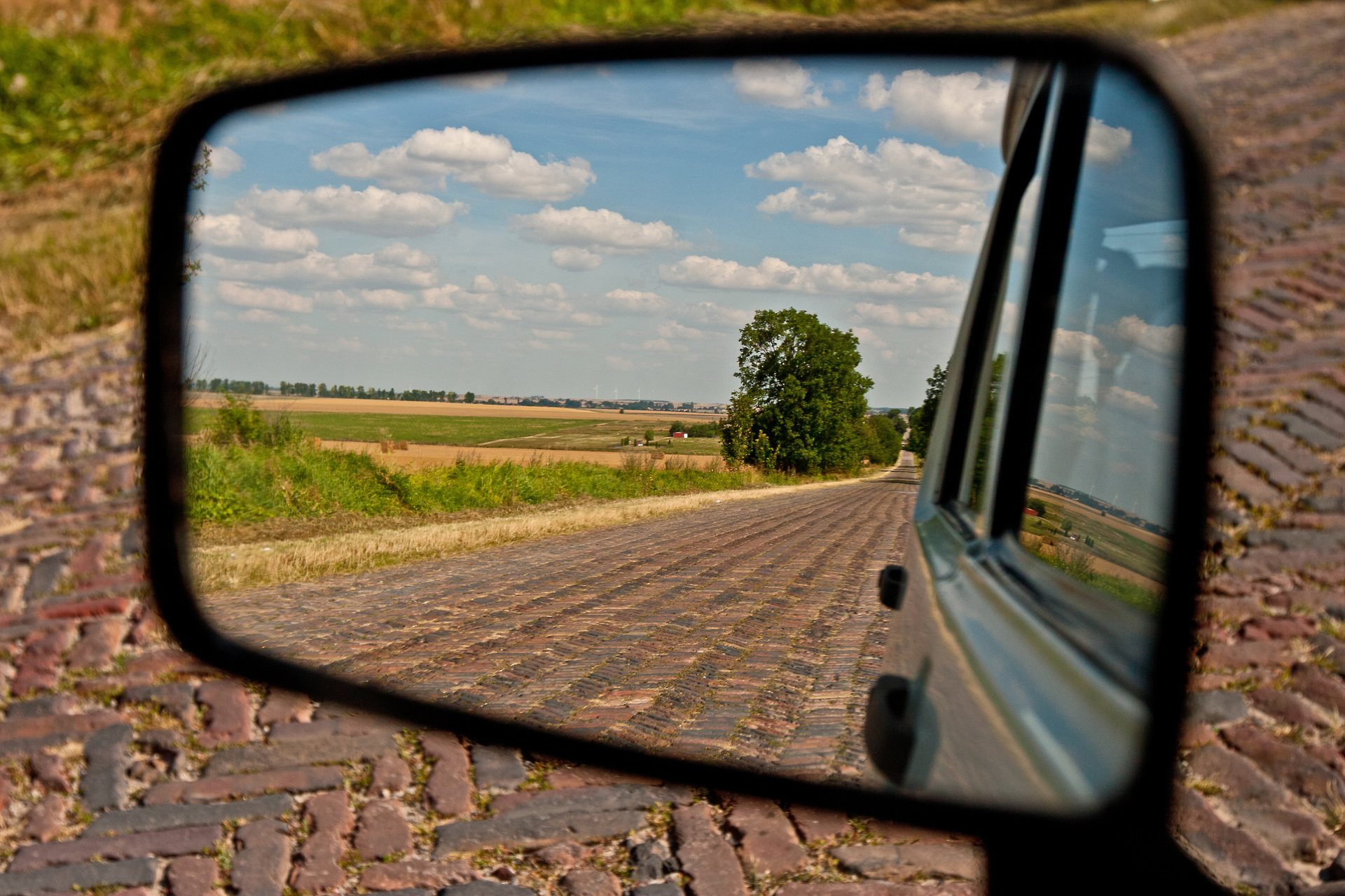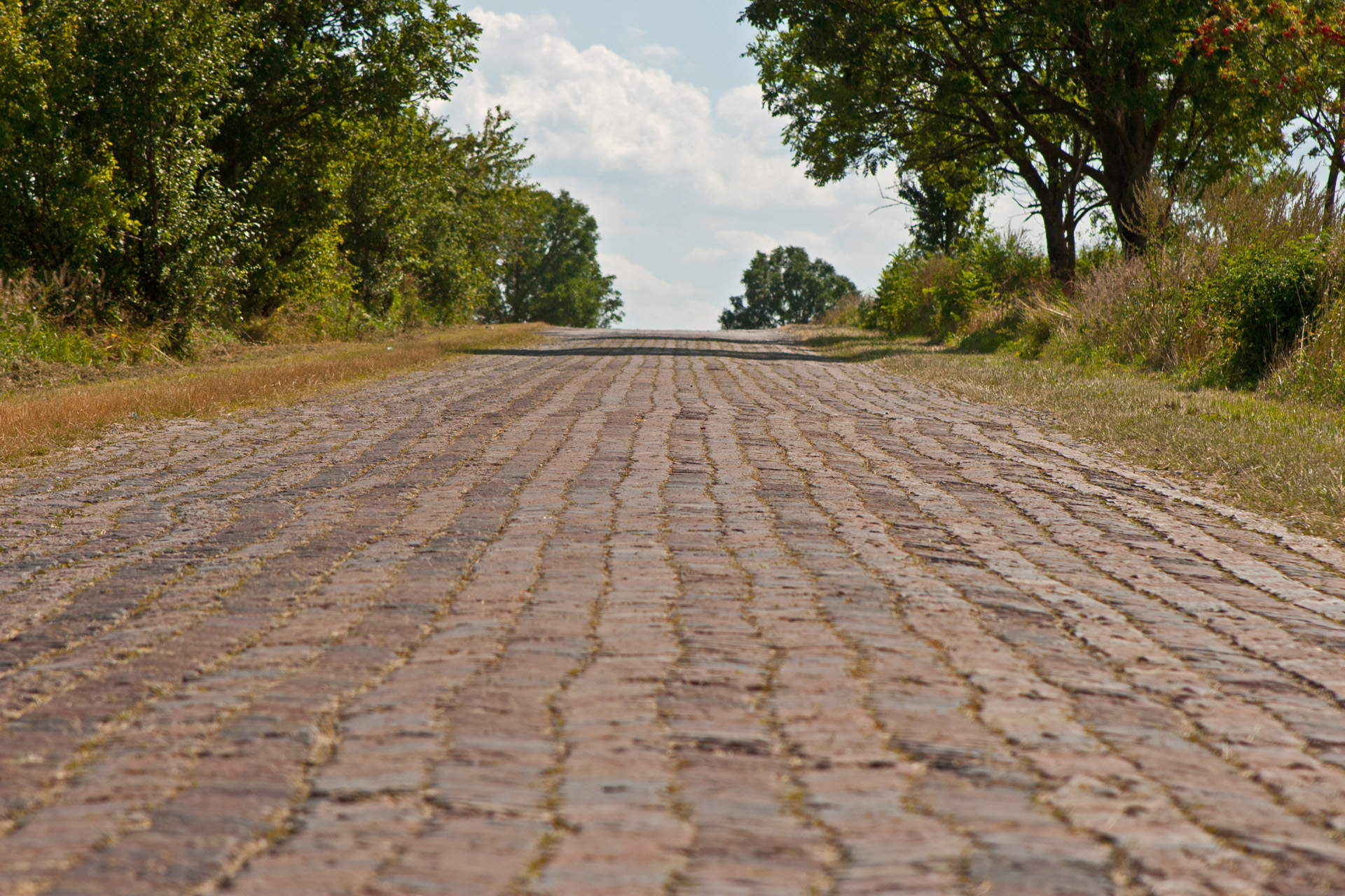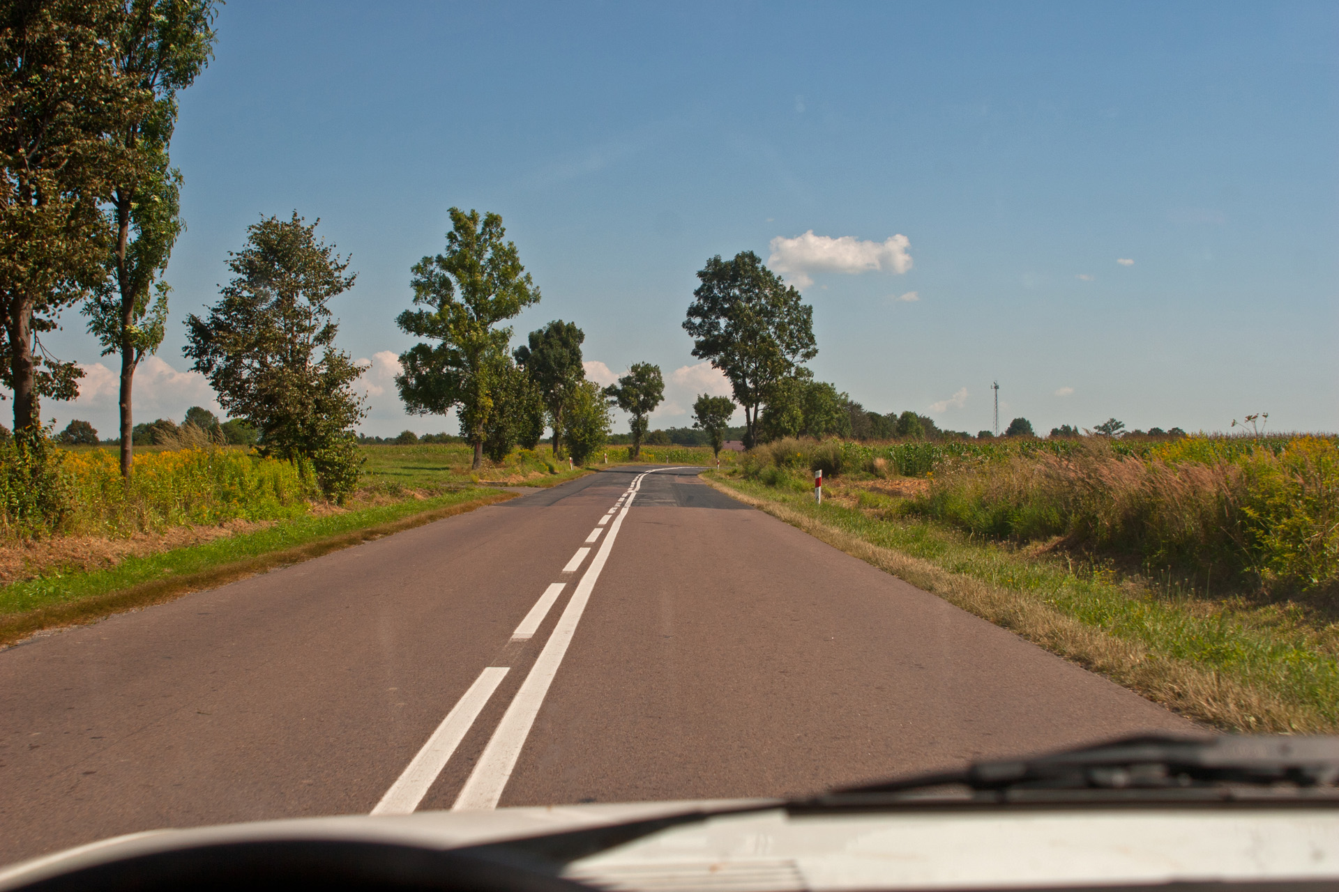 Nagle – jest! Skręt na drogę, która był celem mojej podróży. Klinkierowa nawierzchnia unosi się i opada w rytm falujących wzgórz. Po obu stronach pola. Koszą traktorem i kombajnami – jak u inżyniera Mamonia.