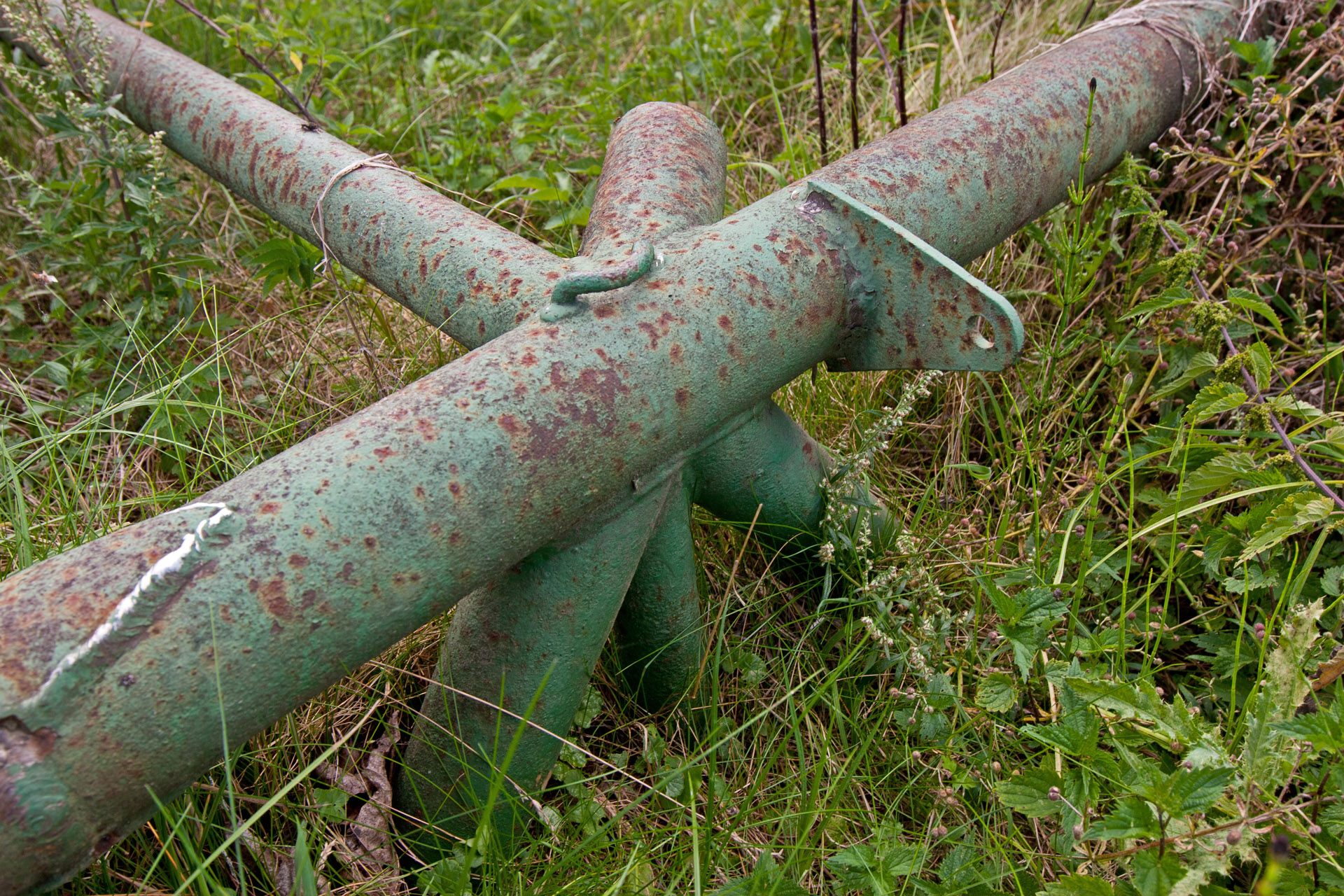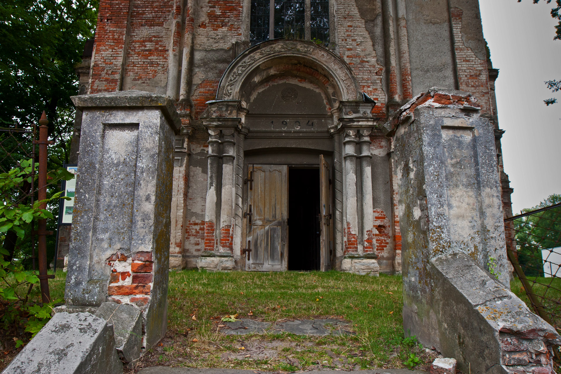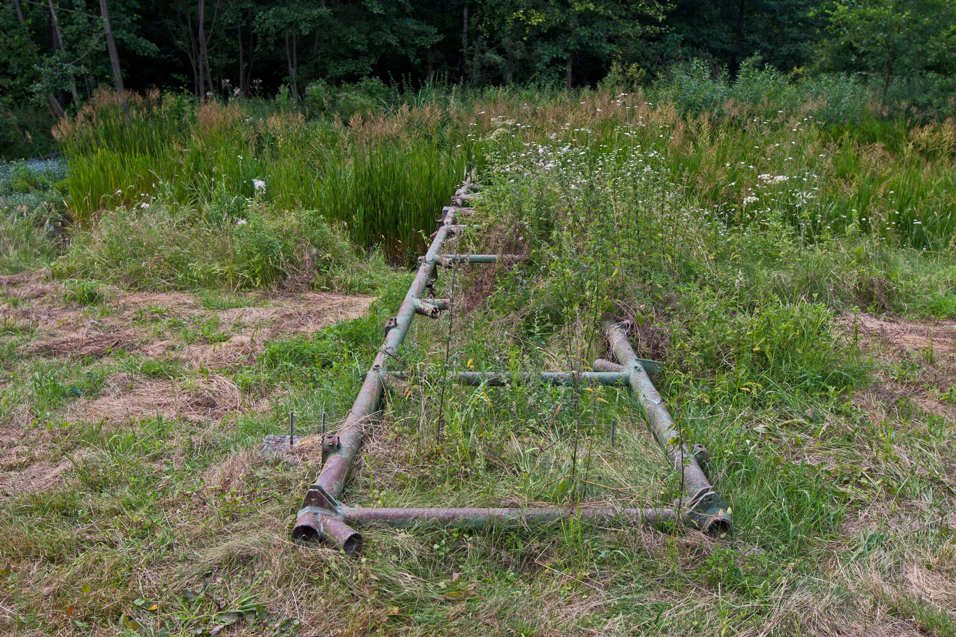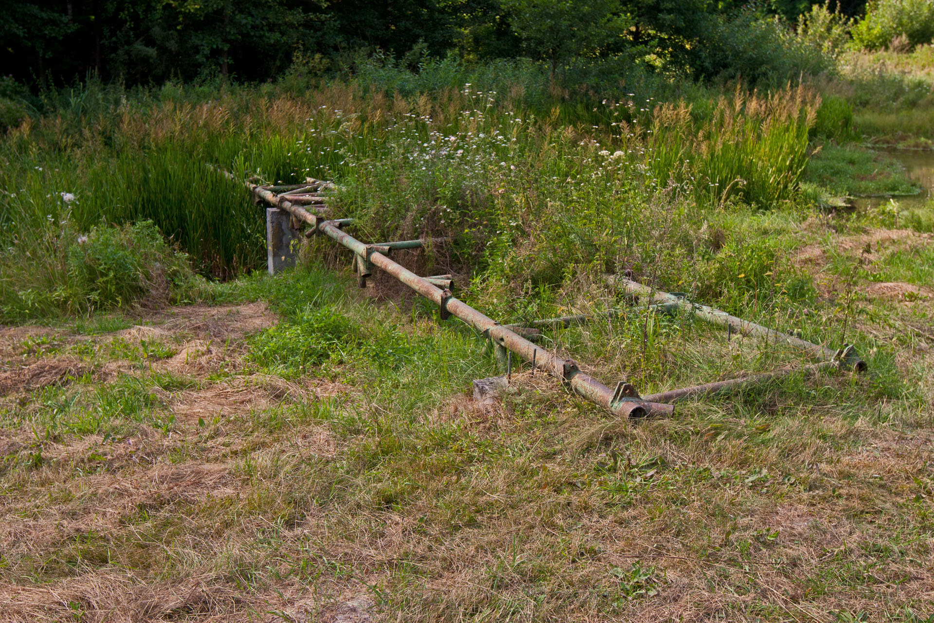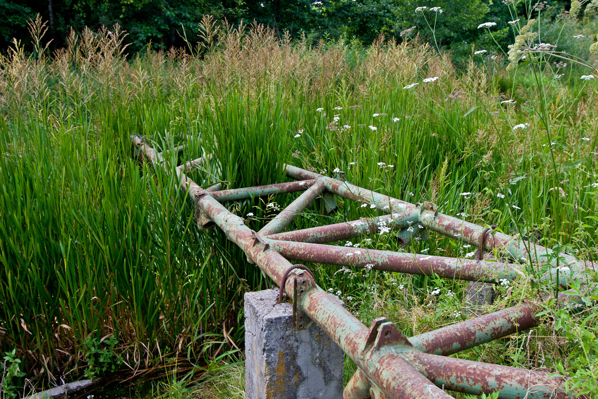Zatrzymuję się przy kościele. Nie ma żywej duszy. Na prawo od kościoła bagno z trzema mostkami. Okazuje się, ze jeden z nich to właśnie kawałek skrzydła olbrzymiego Messerchmitta. Łatwo pomylić go kawałkiem ogrodzenia albo kładką wykonaną przez lokalnego mistrza migomatu. A może skrzydło to tylko legenda? Jak Tytanowy Janusz.